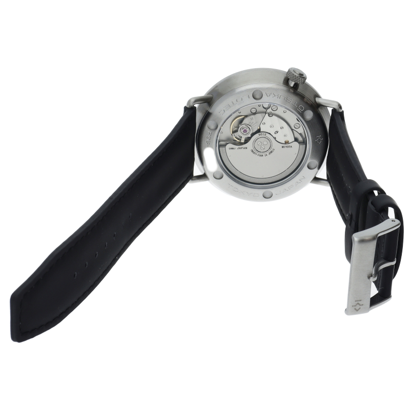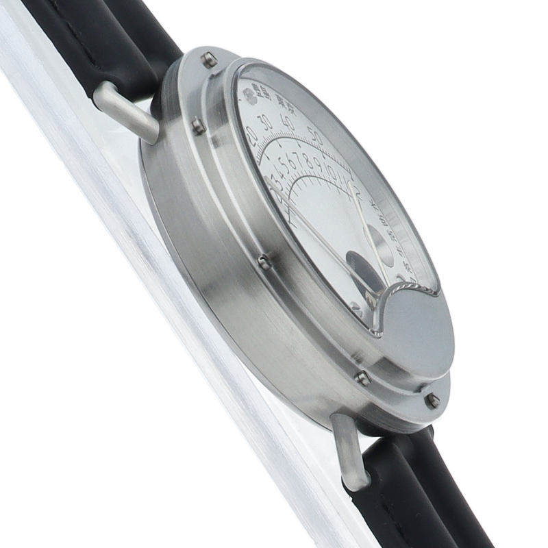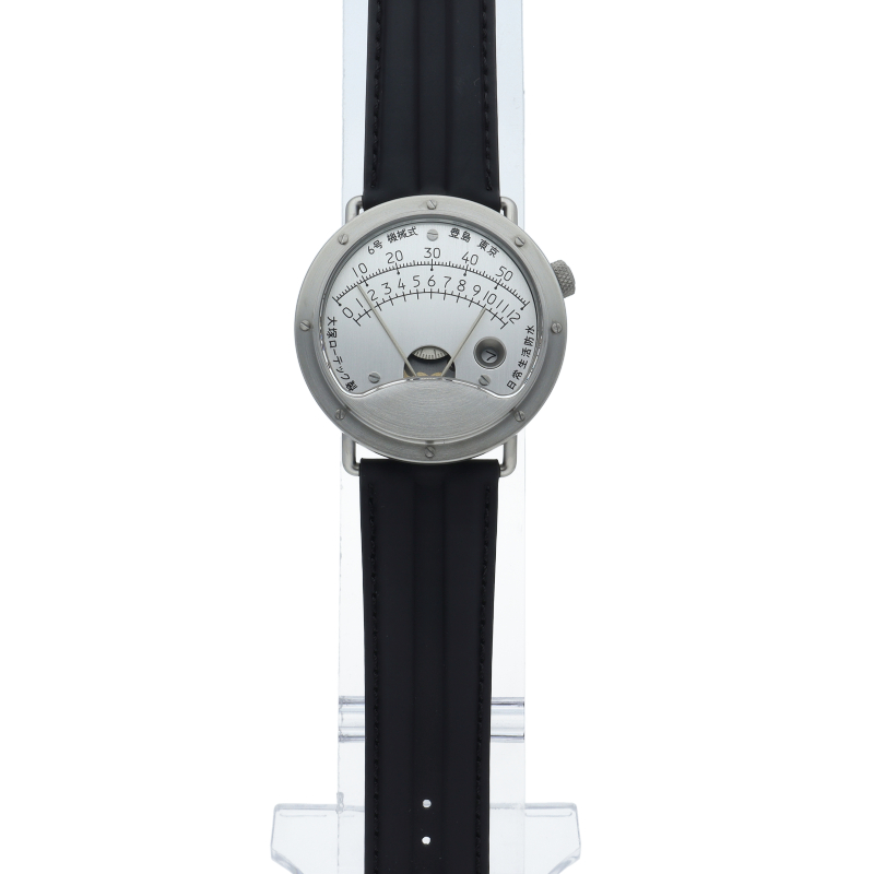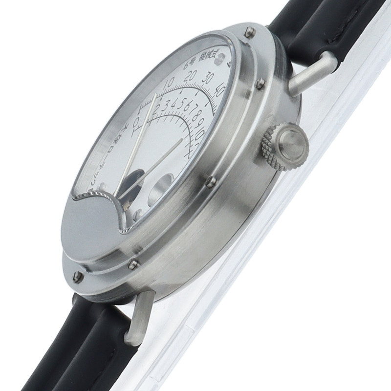 扇型に表示されるアナログメーター。旧モデル6号から、動作安定性と耐久性の向上を図るために設計、使用素材、加工方法を改良。外装の変更としては時分針の両サイドや、ビスの頭(ベゼルや文字盤上)に面取りを施している。ケース素材をSUS303からSUS316Lに、風防をミネラルガラスからサファイアクリスタルガラスに変更。ブランドロゴを刻印した尾錠と専用デザインのストラップを採用した。