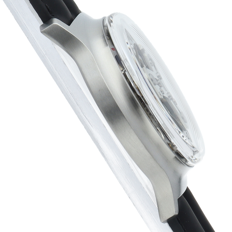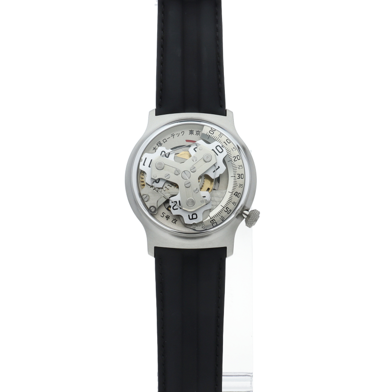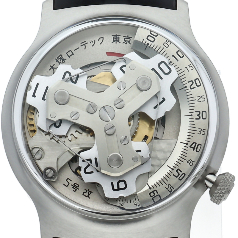 大塚ローテックの中でも新作である「5号改」。衛星のように動く数字盤と、固定された目盛りが組み合わさって時間を刻むサテライトアワーウォッチ。自社製モジュールをMIYOTA製ムーブメントの上に搭載。8時位置のボールベアリングローラーに直接当たることで、ジャンピングアワーのように瞬時に切り替わり、その時ディスクが時計右側の分メモリを指すことによって時間を読み取る。5時位置のディスクは秒ディスクになります。