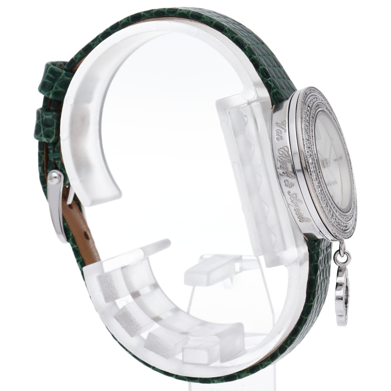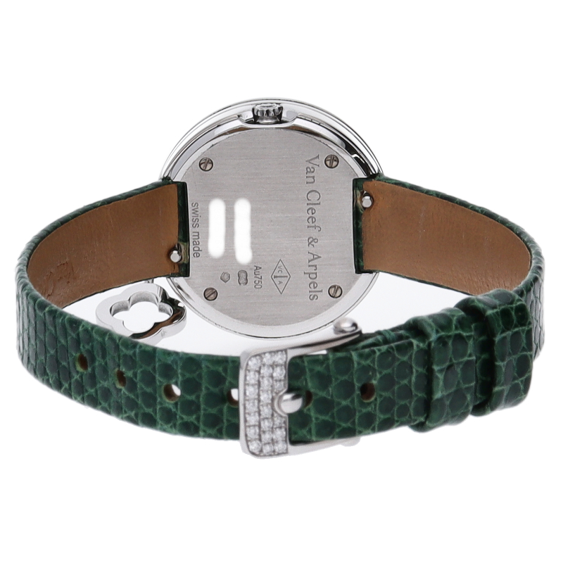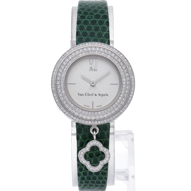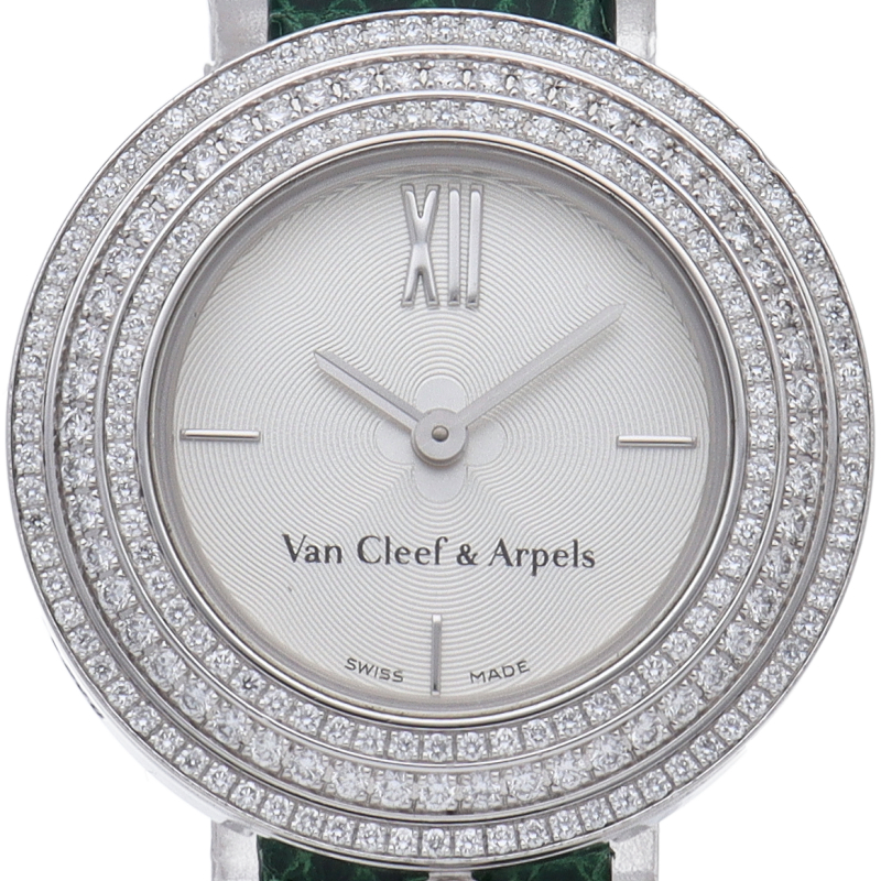ヴァンクリ-フらしい高級感漂う上品なラウンド型ドレスウォッチです。丸みを帯びたシルエットにラッキーチャームがあしらわれて可愛らしいデザインとなっております。