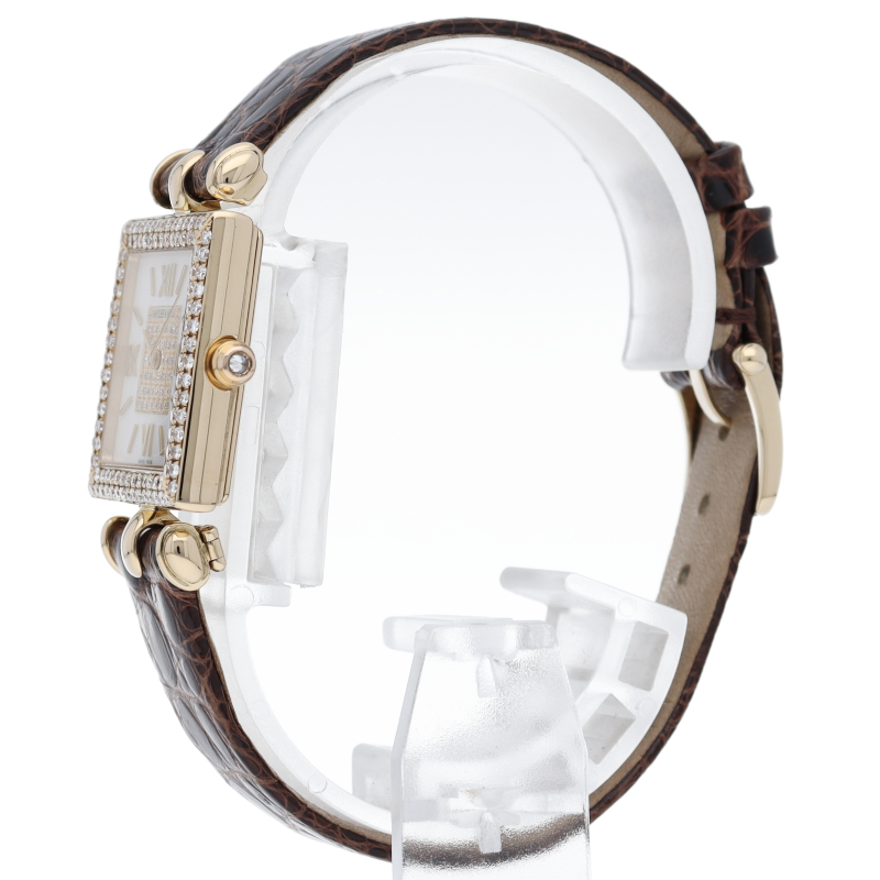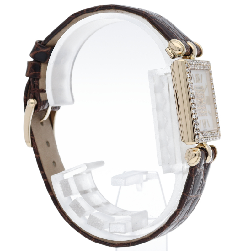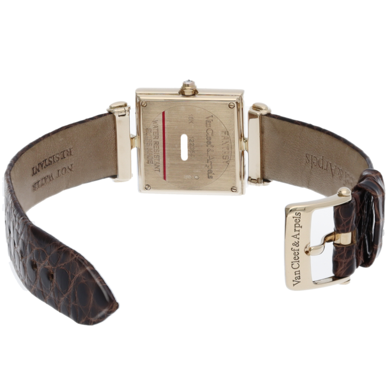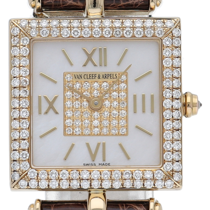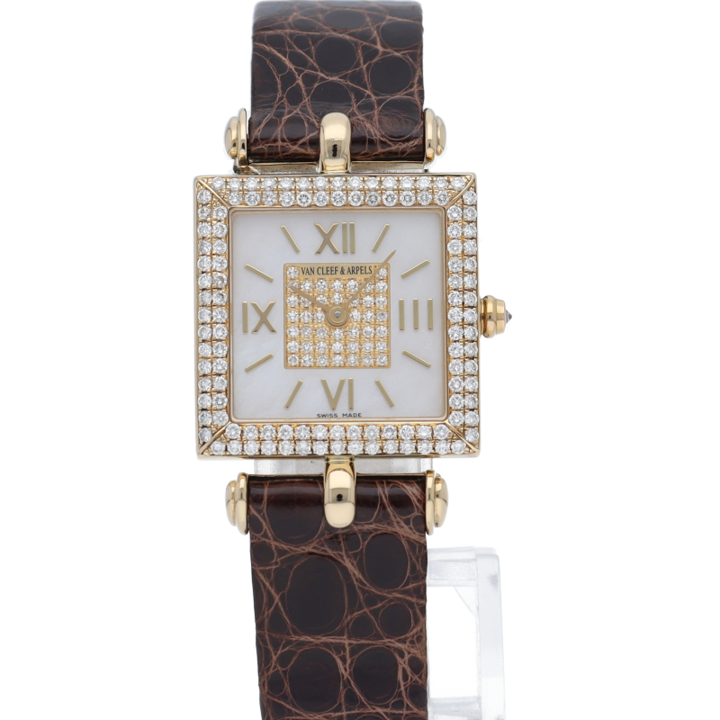 人気宝飾ブランド「ヴァンクリーフ&アーペル」の上品かつ高級感溢れるクラシックウォッチ。文字盤にはシェルを使用し文字盤やベゼルにはダイヤが施された豪華な逸品です。