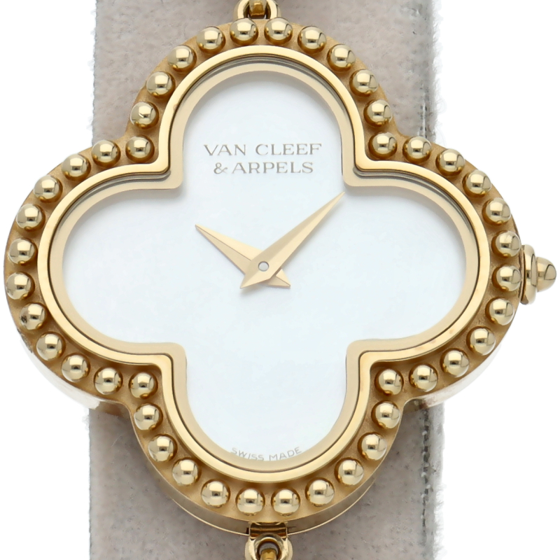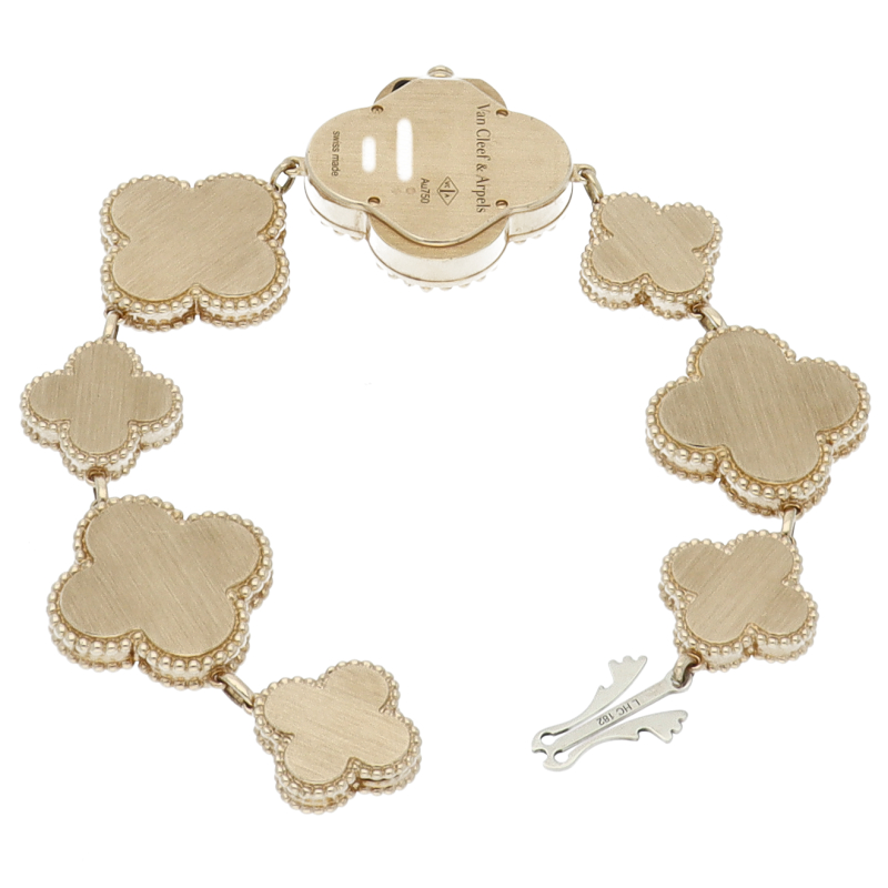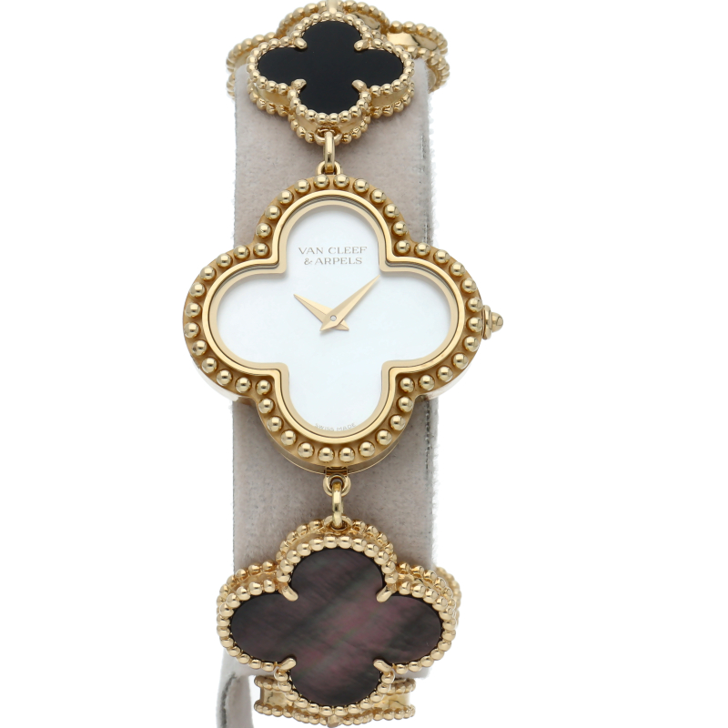人気宝飾ブランド「ヴァンクリーフ&アーペル」の代名詞アルハンブラのクローバーブレスレット時計です。時計の機能と優美なブレスレットを兼ね備えたブレスウォッチです。上品で繊細な作りが大変素敵です。