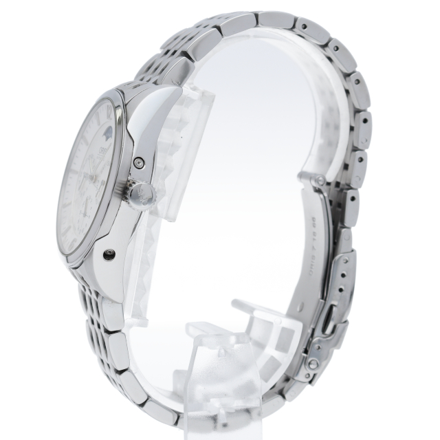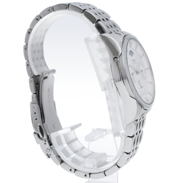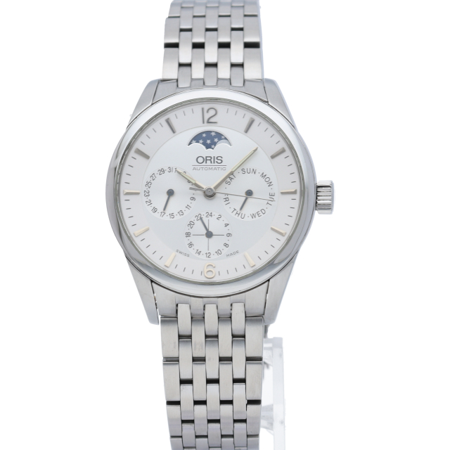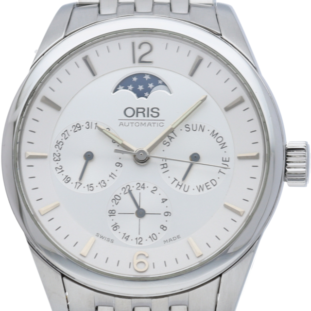 オリスのコンプリケーションモデル。複雑機構のムーンフェイズ(月齢表示)を装備した36ミリ自動巻きモデルです。3つの小窓にポインターデイ&デイトとセカンドタイム表示を配した、ビジネスにもプライベートにも活躍する、まさに大人の為の腕時計です。