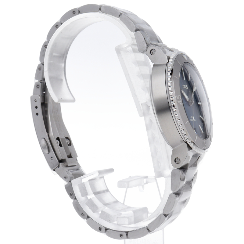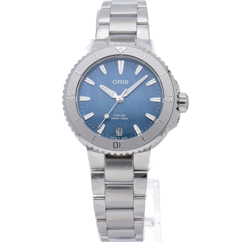 エーゲ海色のアクイスデイトはひときわ目を引くダイバーズウォッチです。マザーオブパールで作られた、サンセットに輝く海のような文字盤は、高機能にエレガンスを添えます。テーパーのかかったシルエットは、アクイスコレクションの中でも印象的なものです。