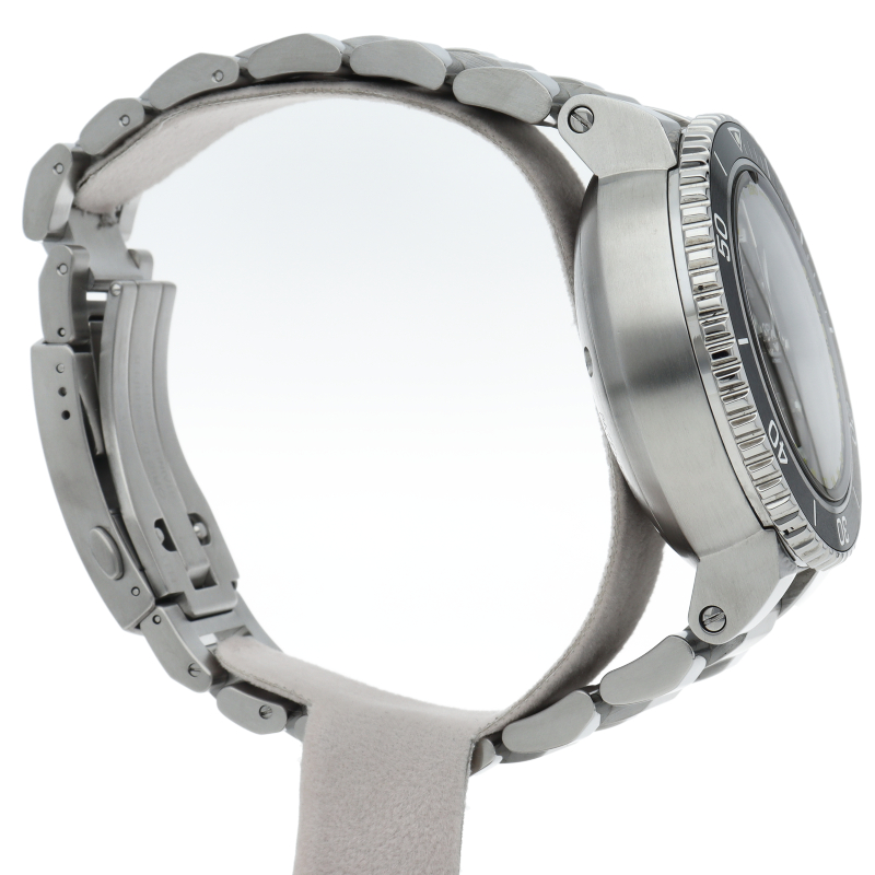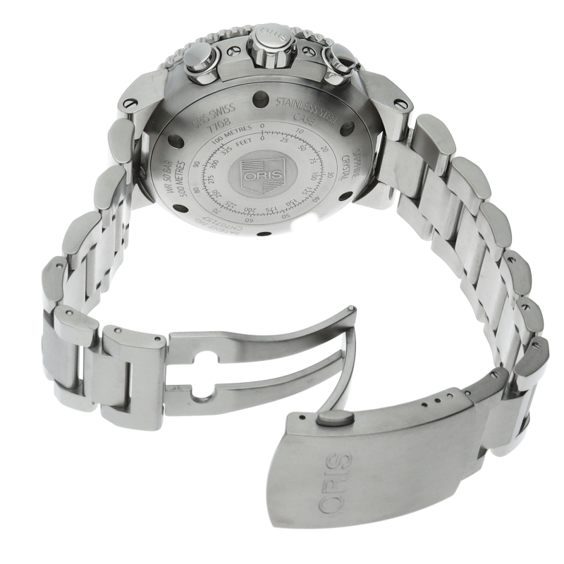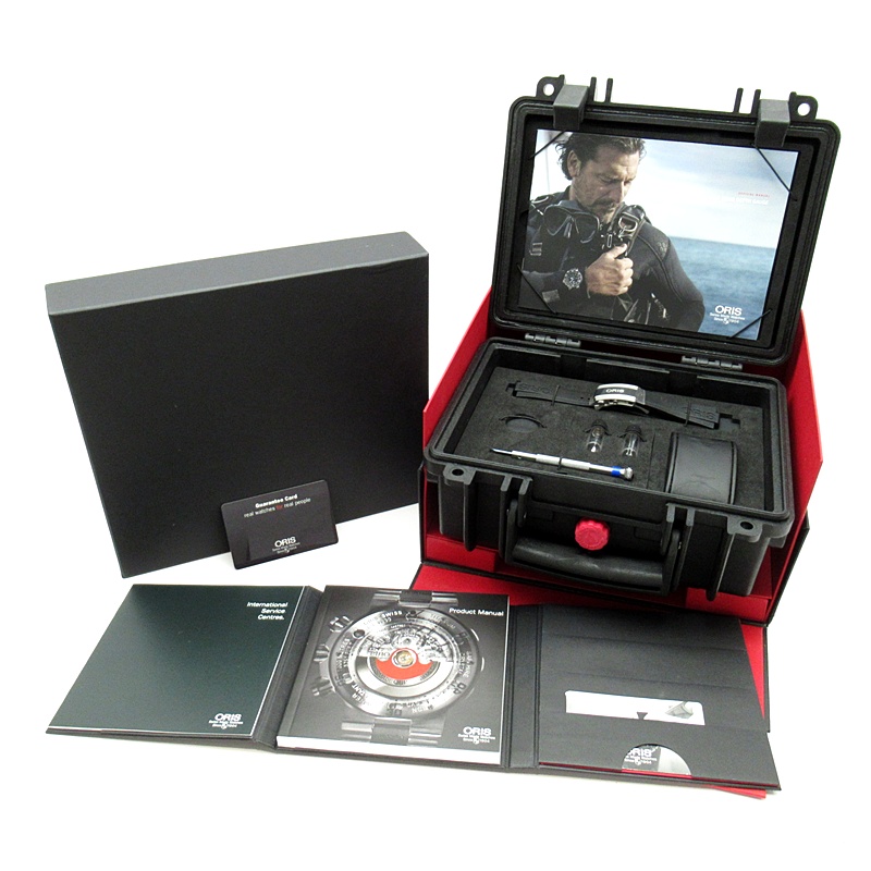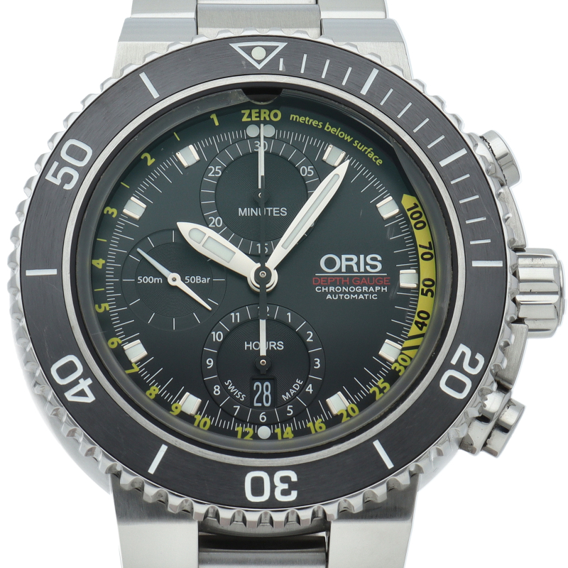 オリスが提案するスタイリッシュなフォルムのダイバーズ時計アクイス。デプスゲージは水圧で空気を圧縮し、水深を測定することができる機構を採用した、プロフェッショナル向けに制作されたモデル。