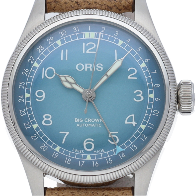 オリスとチェルボボランテのコラボレーションの始まりは、3種類のビッグクラウンポインターデイトです。アルプスの自然からインスパイアされた色のグラデーションを施したダイアルに、サステナブルな鹿革のストラップをセットしました。同じ鹿革で作ったポーチとカードケースが付属します。