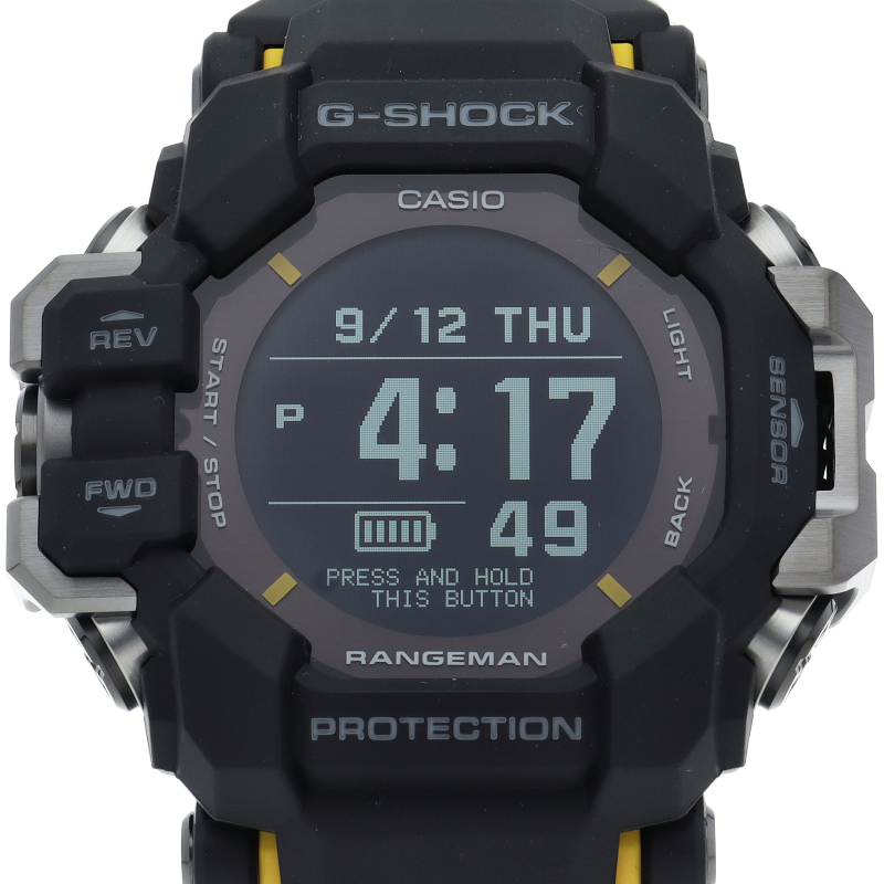 過酷な環境下での使用を想定したG-SHOCKのMASTER OF Gシリーズ「レンジマン」。心拍計とGPS機能を搭載したタフネスウオッチです。マッドレジスト構造に加え、高精細、高コントラストで見やすいMIP液晶を採用。シチュエーションに合わせて画面をカスタマイズできます。過酷な環境下での活動をサポートし、自身の運動状況を把握しながらの活動が可能です。