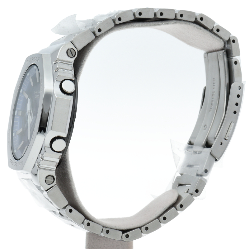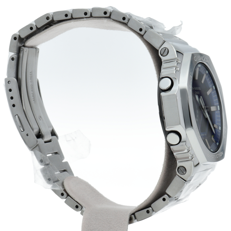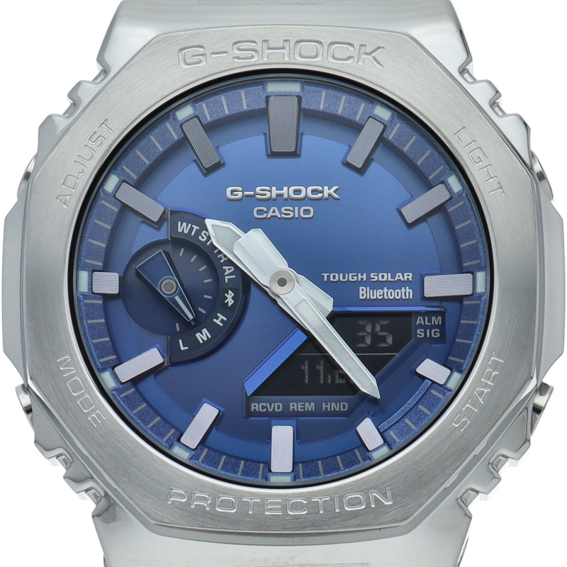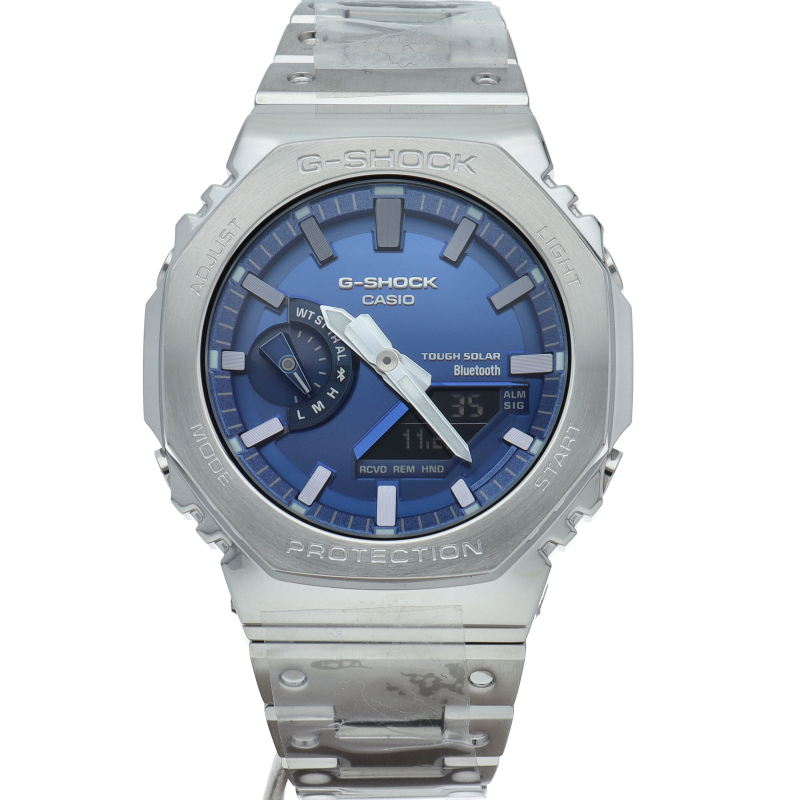 1983年の誕生以来タフネスを追求するG-SHOCKから、ダイアルに鮮やかなブルーを採用したフルメタルシリーズです。文字板にメタリックブルーの蒸着加工を施すことで、ステンレス製のベゼルとバンドに調和させています。