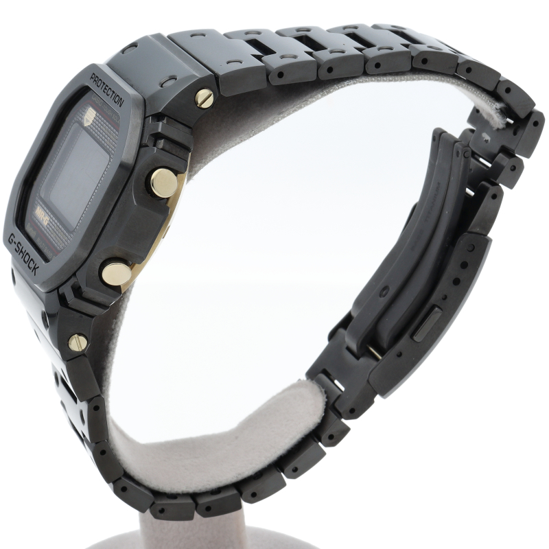 G-SHOCKの最上級ラインである「MR-G」シリーズ。MRG-B5000は、G-SHOCKの初代モデルDW-5000Cをこだわりの金属素材と丹念な仕上げにより、MR-Gとしてつくり上げたモデルです。複雑な形状のベゼルを25個の部品で構成。パーツごとに細部まで研磨を施すことができ、より高い質感に仕上がりました。