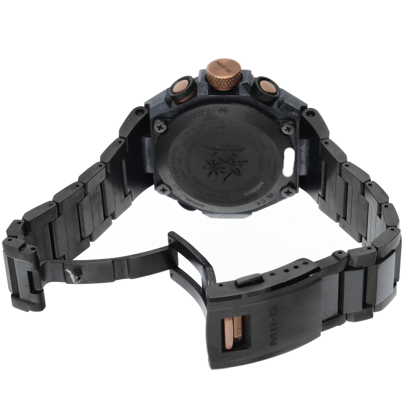G-SHOCK最上級ラインMR-Gの特別仕様のモデルです。MR-Gのために製作された日本刀、「重力丸・燦」をモチーフに、日本刀特有の伝統技法と美意識をMR-Gとして表現しました。ベゼルは、再結晶化ハイブリッドチタンの採用により、刀匠・上山輝平の刀の「刃文」を表現しています。MRG-B2000JS-1AJR。