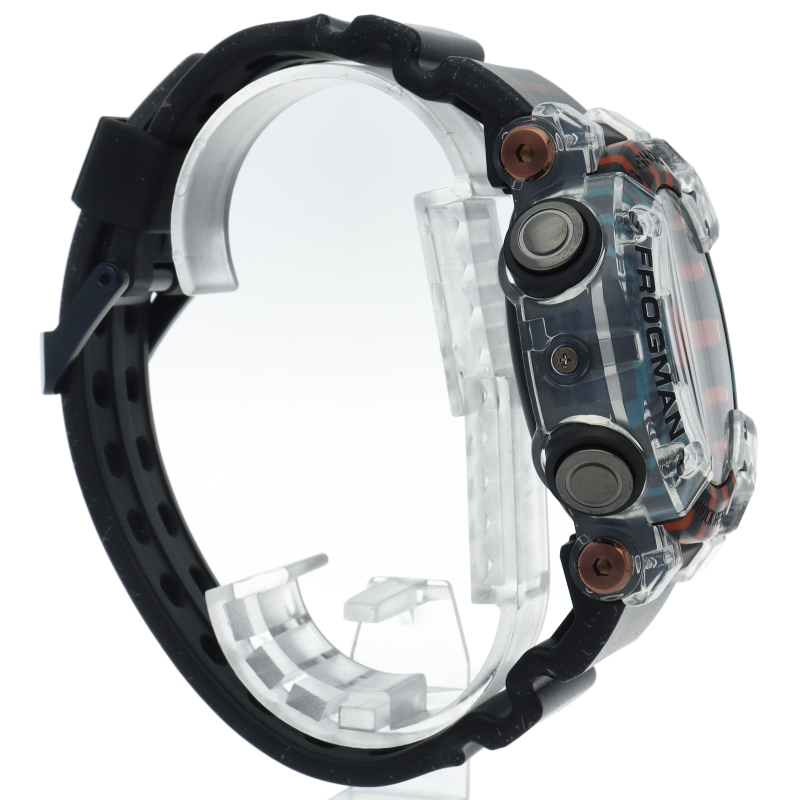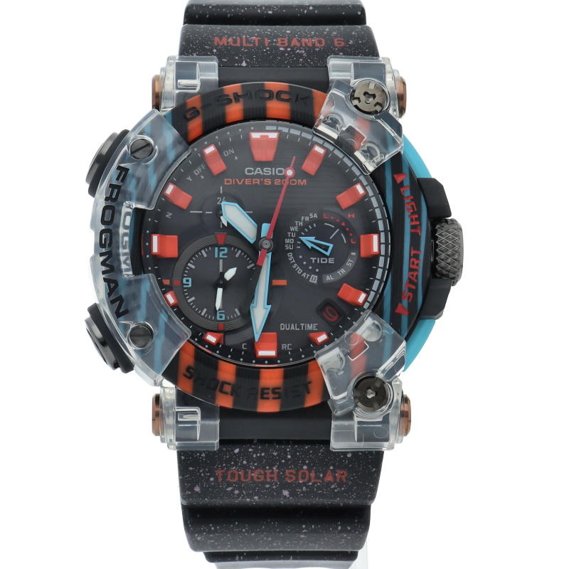 G-SHOCK MASTER OF Gの本格ダイバーズウオッチ「FROGMAN(フロッグマン)」誕生30周年を記念したスペシャルモデルです。南米のアマゾンに生息する希少なヤドクガエルをモチーフに、その神秘的な色彩を表現するためマルチカラーカーボンをベゼルに採用しました。