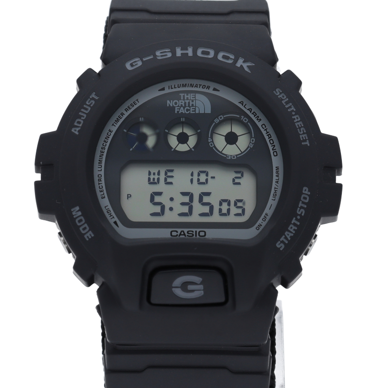 カシオ G-SHOCKの6900シリーズ。ノースフェイスとのコラボレーションということでアウトドアライクなマジックテープ式のナイロンスポーツタイプのベルトが採用されております。ベルトの手首部分の内側のロゴ以外は極めてシンプルなため、幅広いシーンでお使いいただけます。