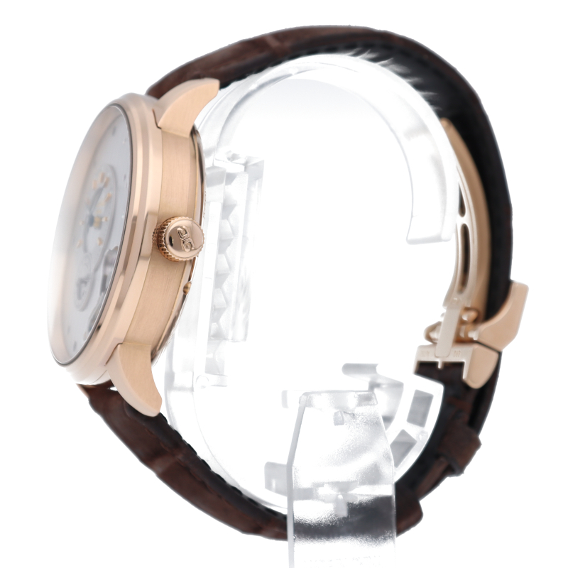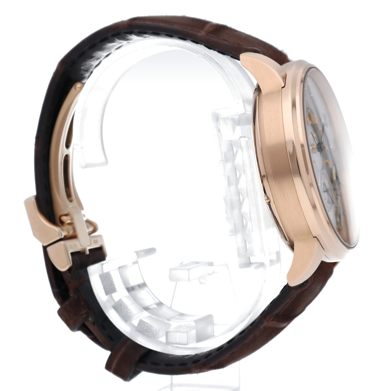 1845年の創業以来、ドイツを代表する老舗時計ブランドであるグラスヒュッテオリジナル。ムーブメントの地板をそのまま文字盤に採用し、時分針やアウトサイズデイトなどをオフセンターに配された独特なデザインが特徴的なパノマティックインバース。2時から6時位置がくり抜かれており、手作業で彫刻された美しいダブルスワンネックの緩急微調整装置と動き続けるテンプが目を惹きます。