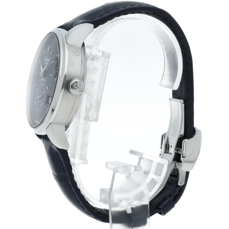 高級感溢れる外観に、ダブルスワンネック緩急針を搭載した美しい自社製キャリバーを堪能できるモデルです。ビックデイト表示、ムーンフェイズなど機能面も充実しています。シースルーバックからはアシンメトリーな構造を持つCal.90-02を眺めることができます。