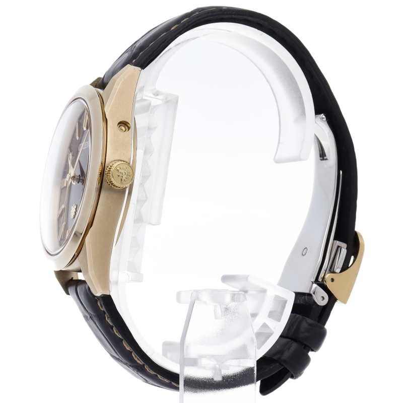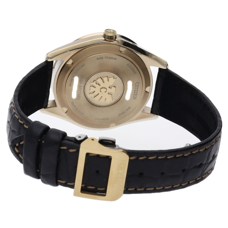 「砂子蒔き(すなごまき)」と言われる伝統的な技法を用いて粉末状にした金沢の金箔を、土佐和紙に施した印象的なダイヤル。黒色和紙に職人がひとつひとつ手作業で金箔をあしらった特別仕様です。AQ4103-16E(A060-A1CT402)