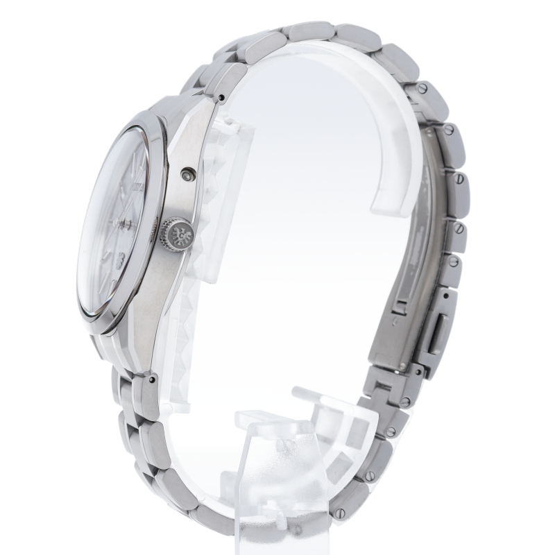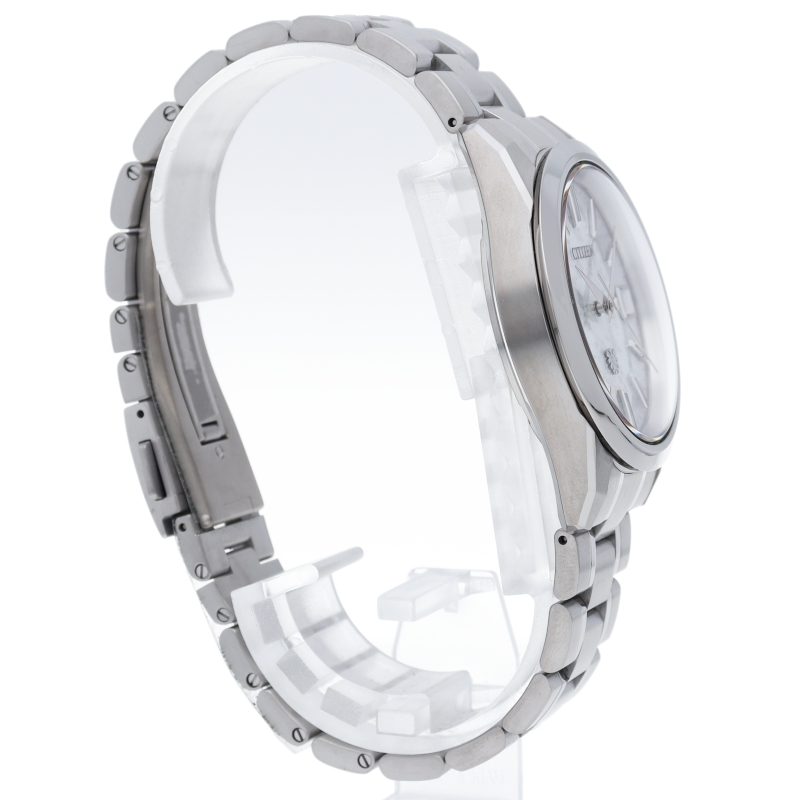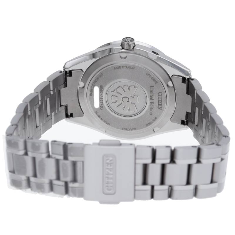 シチズンで人気の電波時計シリーズ「エコドライブ」。こちらは日本三大和紙の一つ、土佐和紙の「雲龍紙」を採用したダイヤルとスーパーチタニウムにデュラテクトプラチナを施したケースを合わせています。電池交換が不要の光発電「エコ・ドライブ」で「年差±5秒」の精度を誇り、ダイヤルには「シチズン クロノマスター」のシンボルであるイーグルマークをあしらっています。AQ4100-65W/A060-A1CT403