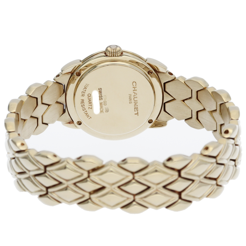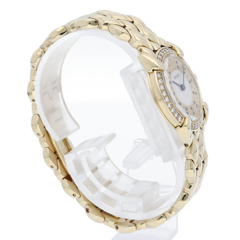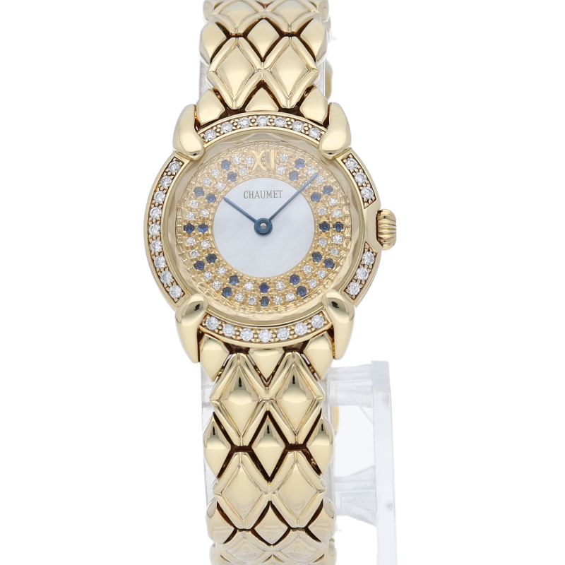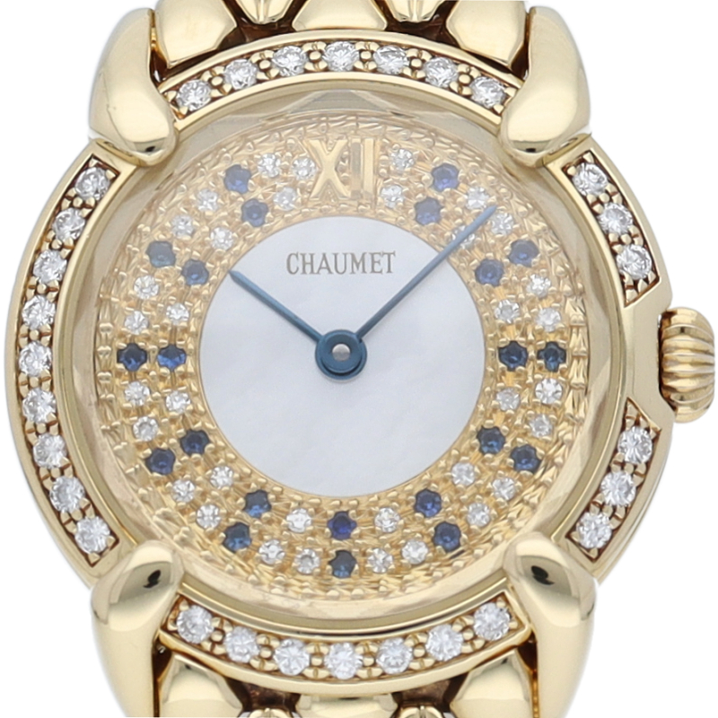 パリ5大宝飾店の1つショーメ。文字盤の中央がシェルになりインデックス部分にサファイアとパヴェダイヤを取り巻いたゴージャスな宝飾時計です。ベゼルにもダイヤでゴージャスな逸品です。