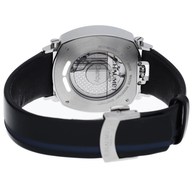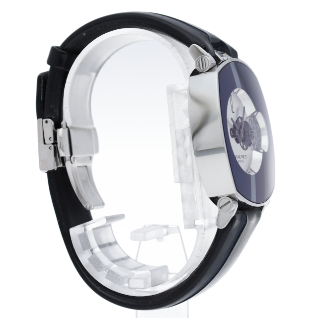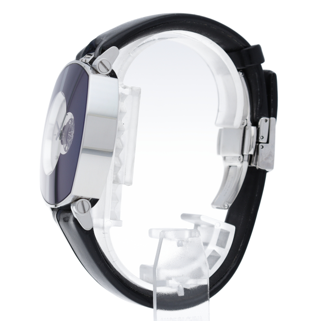 アシンメトリ―の美しさを魅せるオフセンターダイヤルを採用。ブラックメタル加工したサファイアガラスのケースにオープンフェイスのムーブメントが覗きます。ロジウムコートのムーヴメントに、コート・ド・ジュネーブ・ギョーシェの文様が施されています。