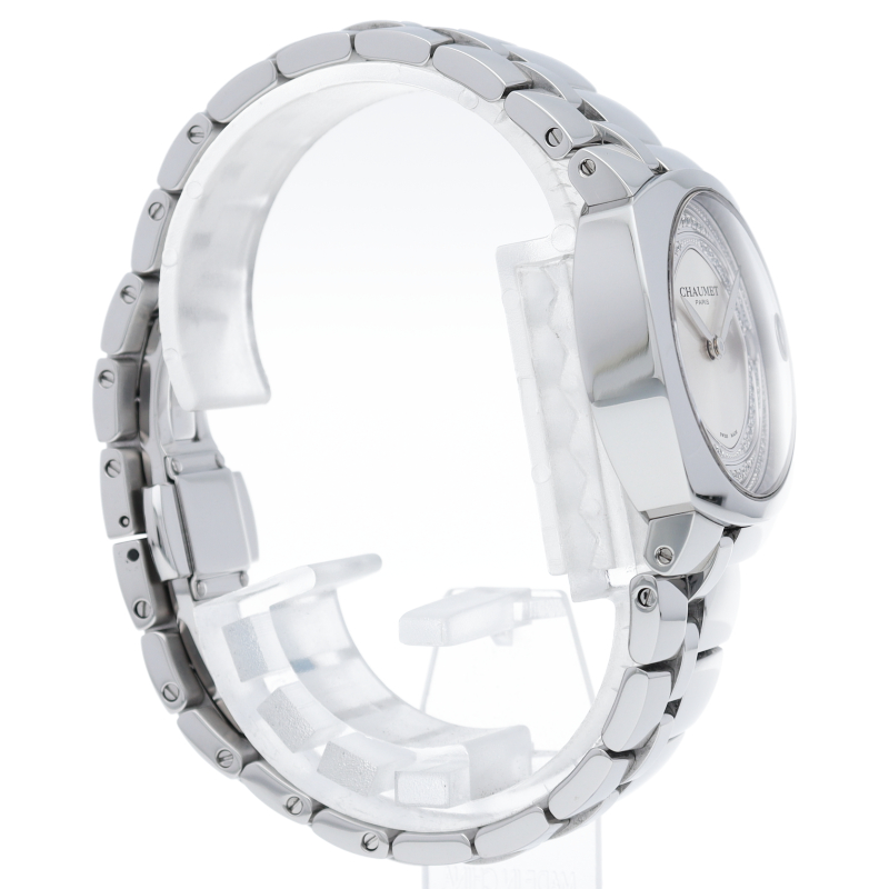 ショーメのダンディコレクションに新たに加わったモデルミスダンディです。ケース径28.5ミリのサイズになり、女性の方にも使いやすい大きさになりました。こちらのモデルは、文字盤にダイヤモンドを施した、豪華なモデルです。