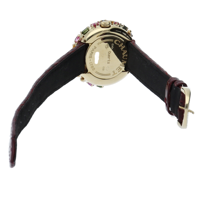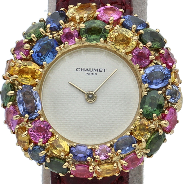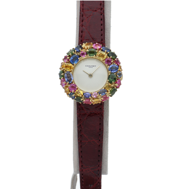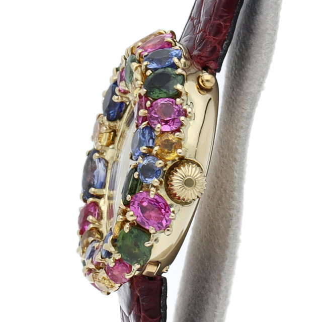 現在生産が終了している「アノー」コレクションは、腕時計の他に、指輪等も展開されていました。アノー(anneau)はフランス語で“輪”を意味しており、名前のとおり、ふっくらとした大きく丸みのある“輪”が特徴的です。イエローゴールドのケースカラフルなストーンが贅沢に施されたとても華やかなモデルです。
