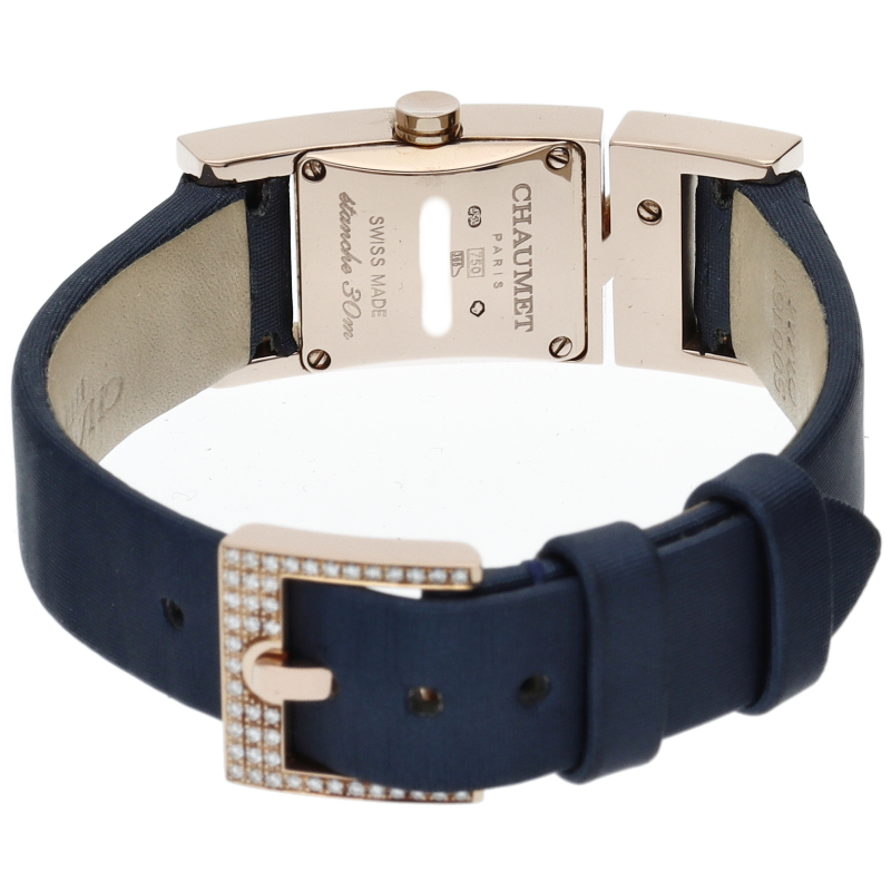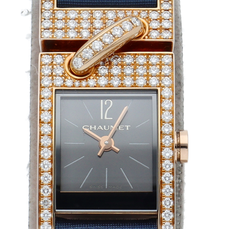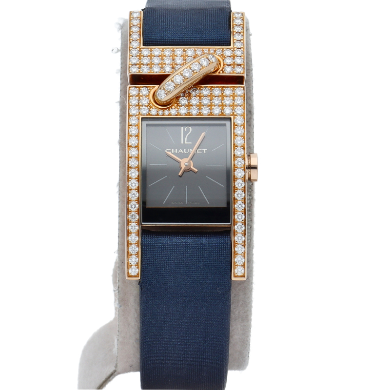 ジュエリーが結ぶ人と人との深い絆を表現したコレクション「リアン・ドゥ・ショーメ」。ピンクゴールドケースと尾錠にダイヤモンドをセッティングした豪華なモデルです。