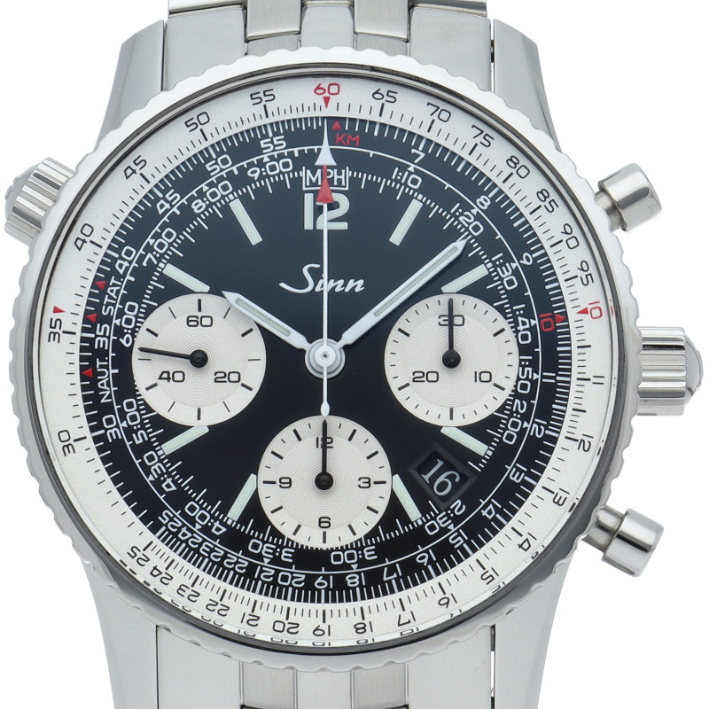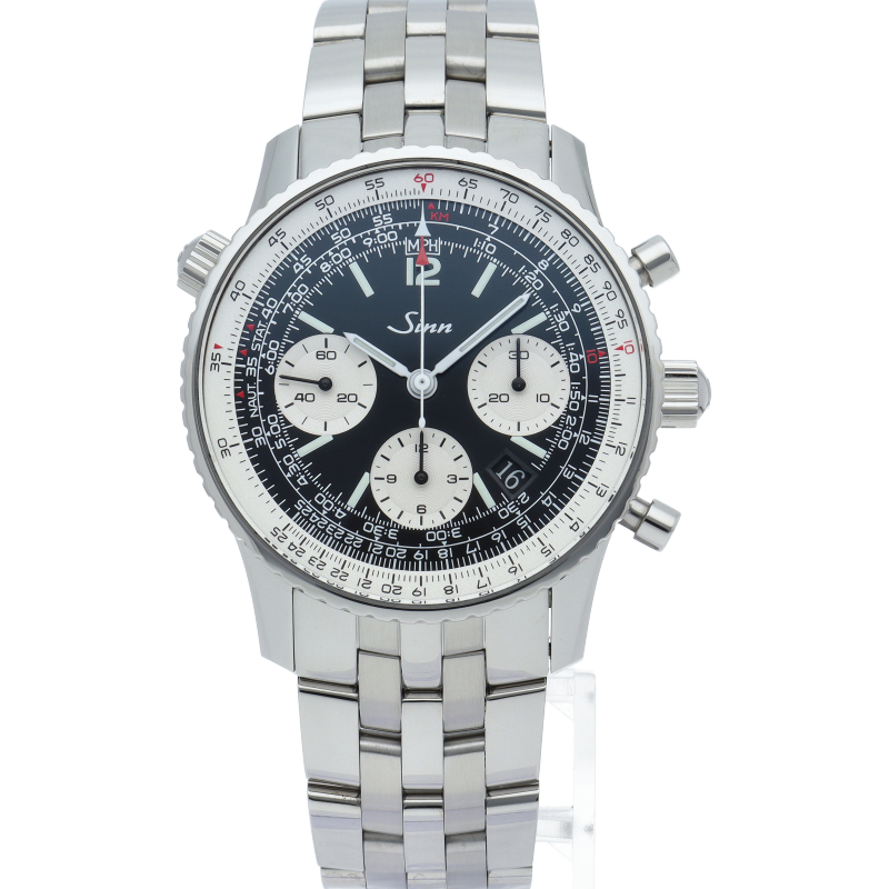 モデル903はパイロット、ナビゲーター、コミューターのための機能が盛り込まれた計時機器です。インナーベゼルに刻まれているスケールで速度、距離、燃料消費、上昇および下降速度をはじめマイルやキロへの換算ができ、このベゼルは10時位置のリューズで操作が可能です。3時位置の30分積算計、6時位置の12時間積算計、9時位置のスモールセコンドを備えた典型的なクロノグラフのダイヤル配置で、2種類のダイヤルカラーがあります。