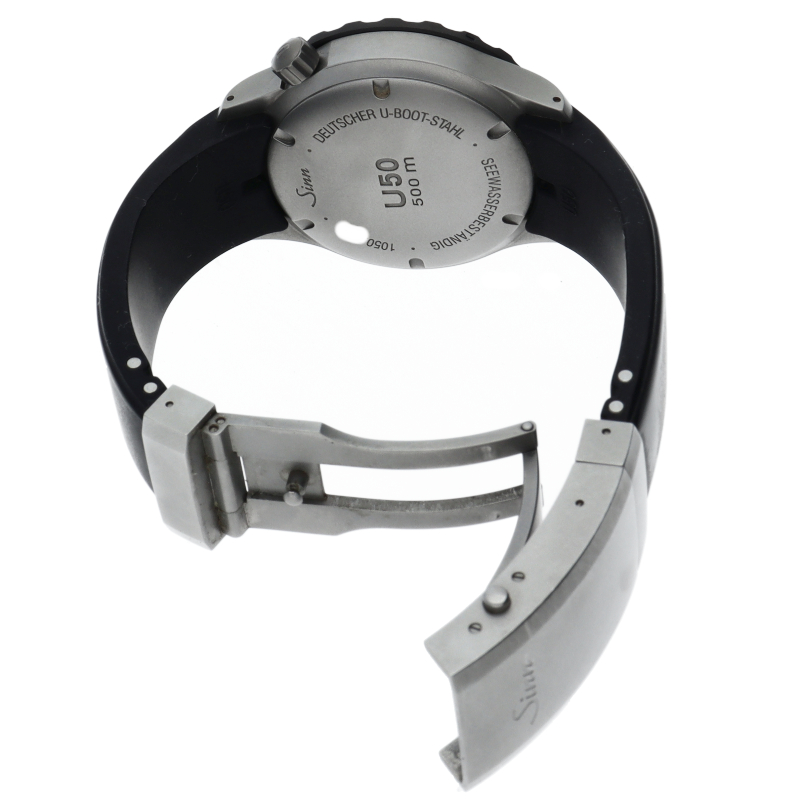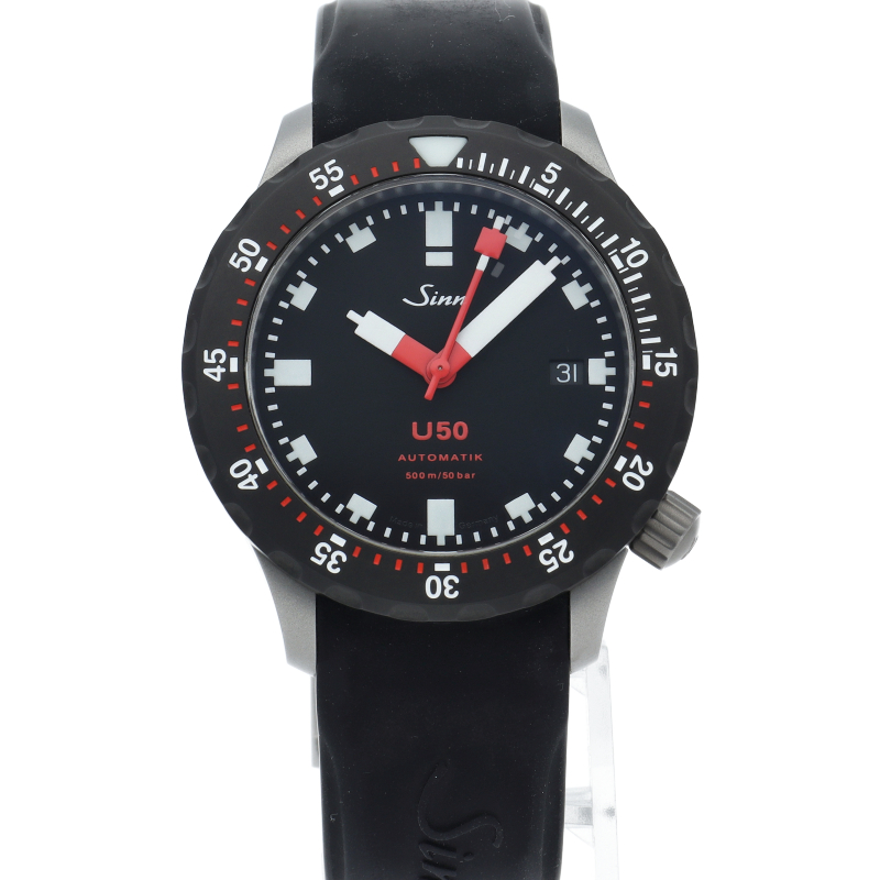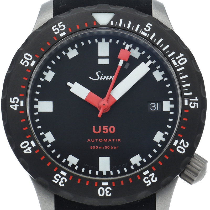 日常生活に快適な着用感を実現する直径41mmのケースサイズに、耐久性と明確な読みやすさを実現したのがU50.SDRの特徴です。マットブラックのダイヤルに、ダイバーズウォッチにとって必要不可欠な要素のみに集中したシンプルさが目を引きます。ケースとリューズには他のUシリーズ同様に、海水耐性に強いドイツ潜水艦の鋼鉄であるUボートスチールを採用。