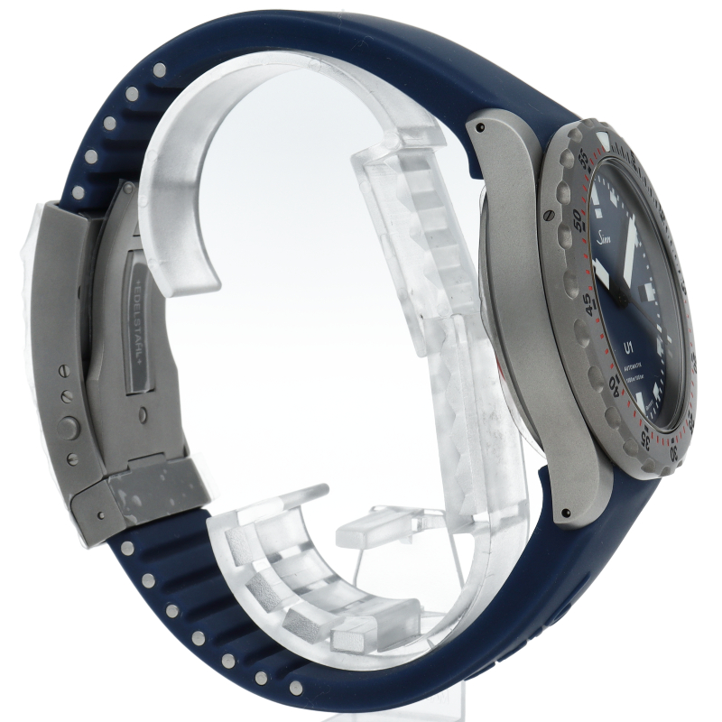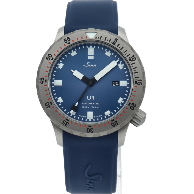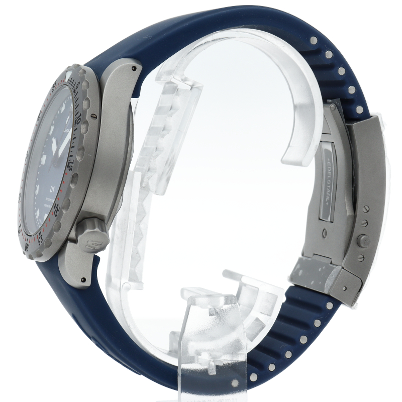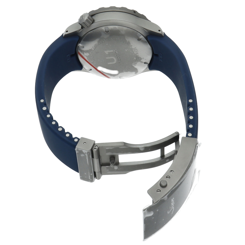 ブルーダイヤルを備えたU1.Bは、真っ白なインデックスと時・分針が強いコントラストを生み出し、常に高い視認性を保証します。 U1.Bの特徴的なダイヤルカラーは、同色のブルーのシリコンストラップによってさらに強調されています。強い衝撃でも外れることのない特殊結合方式によって固定された逆回転防止ベゼルには高い耐傷性を誇るテギメント加工が施されています。