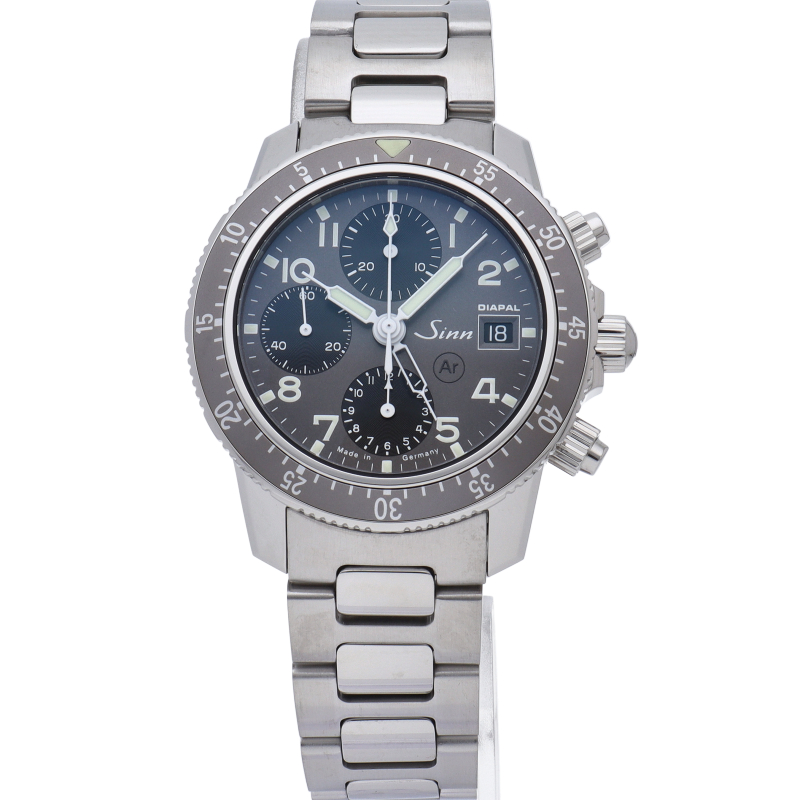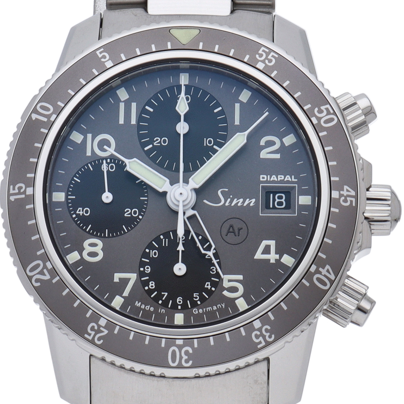 ジン社創設当初の時計作りの精神を踏襲した103シリーズに、ジン独自のテクノロジーであるディアパルを搭載したモデルで、文字盤はグレーとブラックのツートンカラーになっています。ディアパルとはジン社が何年もかけて開発し特許を取得した技術で、潤滑油なしでも摩擦の起こらない素材を組み合わせ、ムーブメントの耐久性を高めるとともに、オーバーホールのインターバルを通常の約二倍へと伸ばすことが可能となりました。