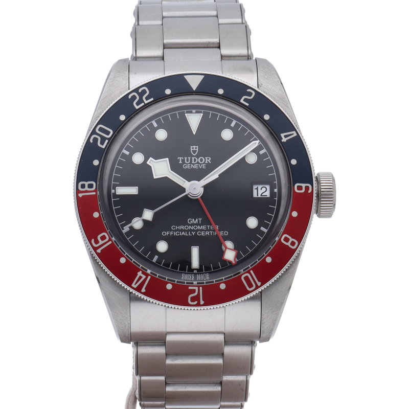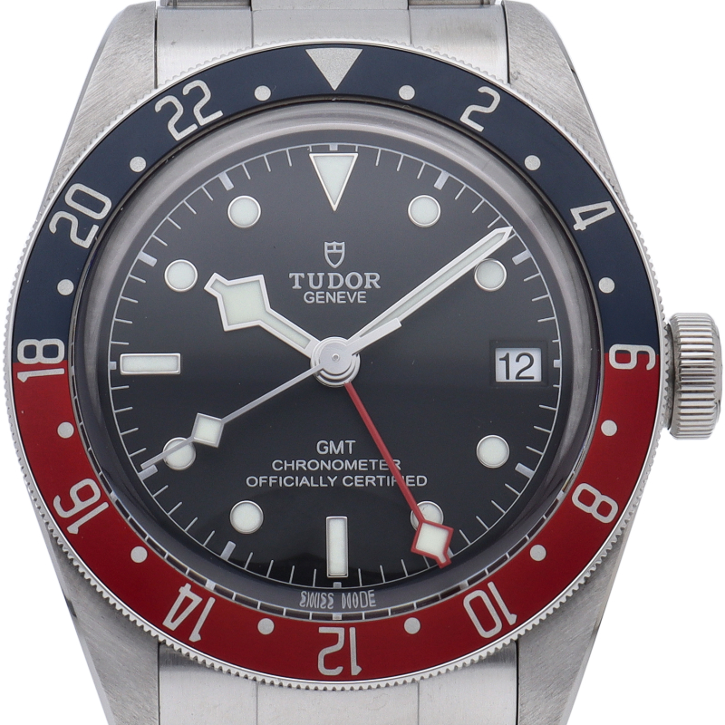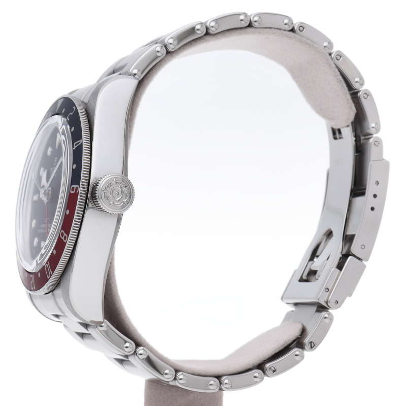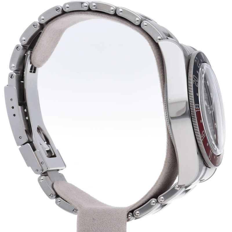 チュードルを代表するスポーツモデル「ブラックベイ」のGMT搭載モデル。ベゼルは昼夜がわかる様「ブルー/レッド」の2トーンの通称ペプシカラーとなっています。過去のダイバーズウォッチからインスピレーションを得た四角い針はGMT針にも付いています。自社製GMTムーブメント「MT5652」を搭載。70時間のパワーリザーブを誇り、クロノメーター認定を受けたムーブメントです。