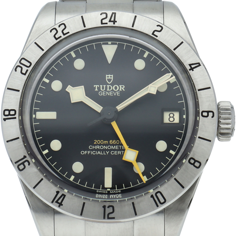 固定式のベゼルに刻印された24時間表示、大きめのイエローの24時間針等、ロレックスの初代エクスプローラー2を彷彿とさせるデザインで話題を呼んだブラックベイプロ。人気機種のフィフティーエイトと同じ39ミリケースを採用しており、日本人の手首周りにも馴染みやすいKサイズ感です。ムーブメントはクロノメーター認定を受け70時間のパワーリザーブを有する、両方向巻上げ式の自社製MT5652を搭載しています。