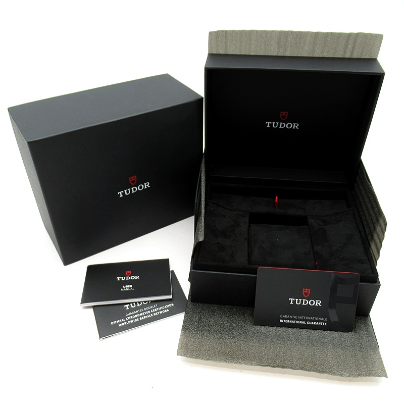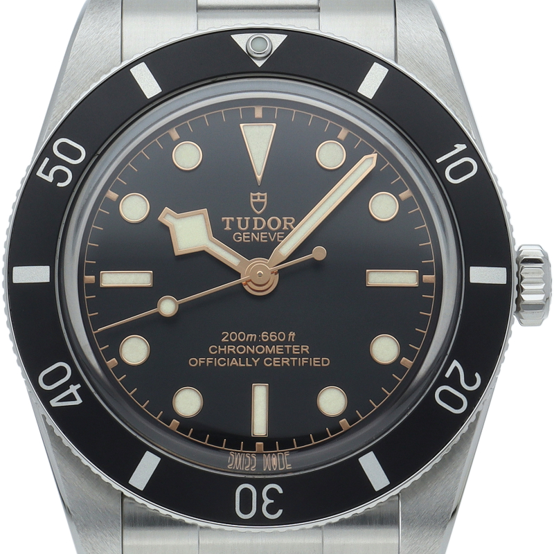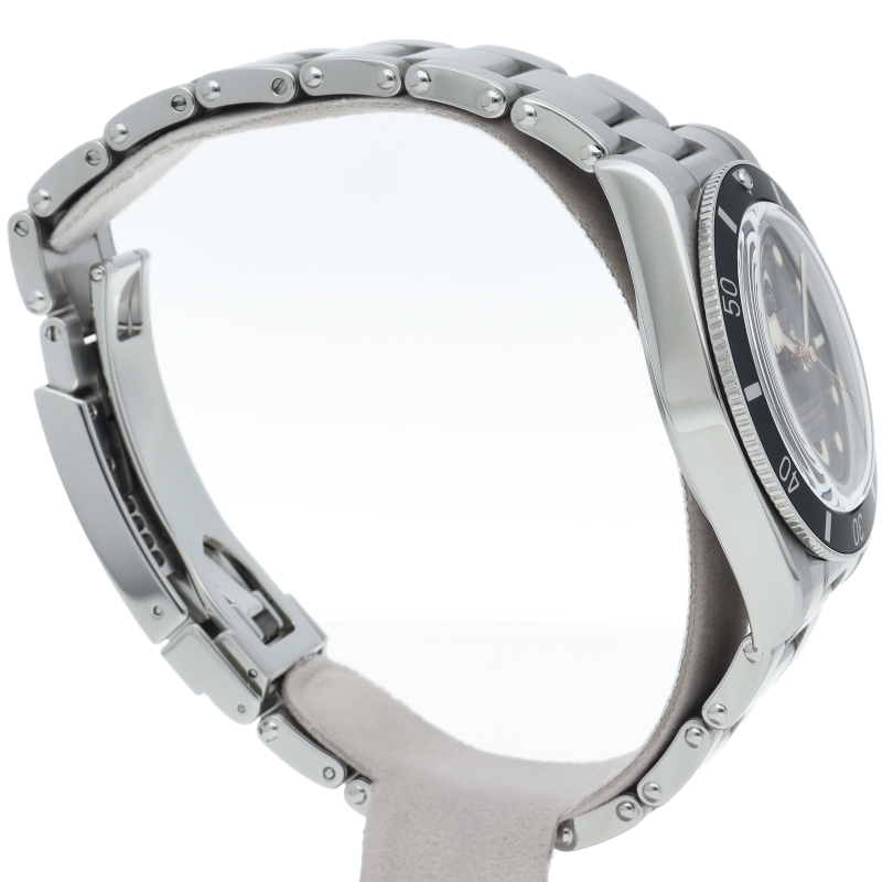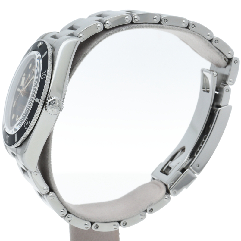 チューダーの初期のサブマリーナに使用されていた通称“イカ針”を採用した「ブラックベイ」。こちらはステンレスタイプで、ケース径37mmモデル。1960年代までのロレックスやチューダーに使われていたリベットブレス仕様のダイバーウォッチです。