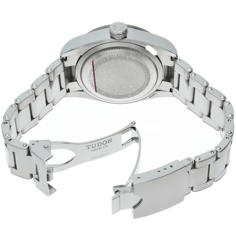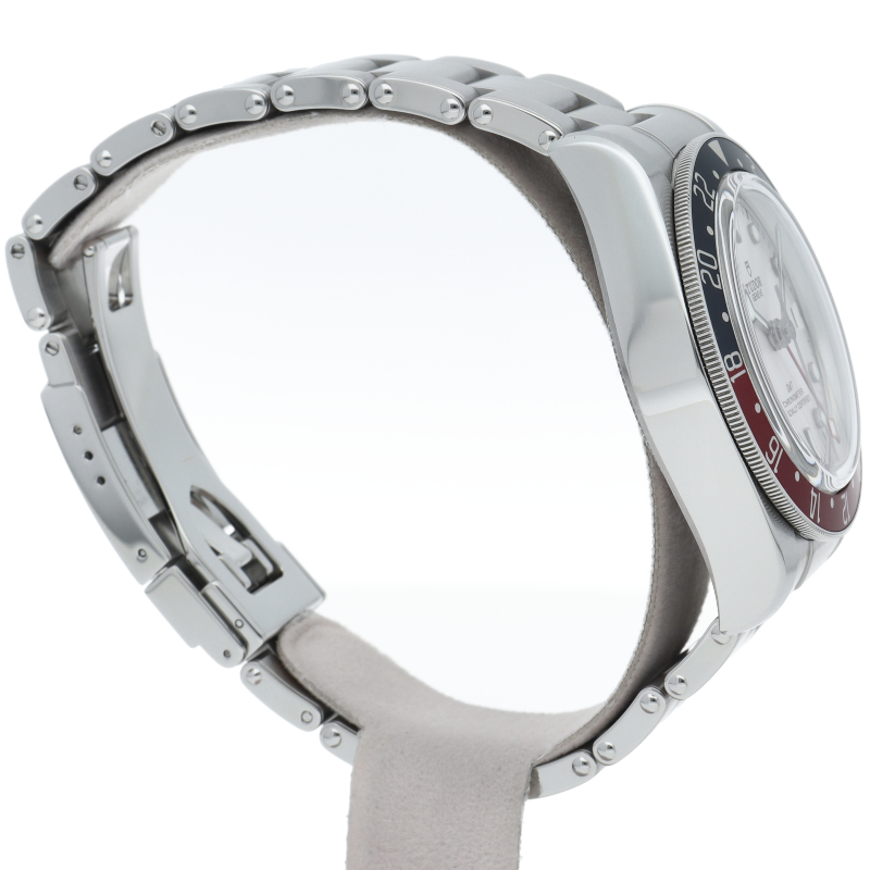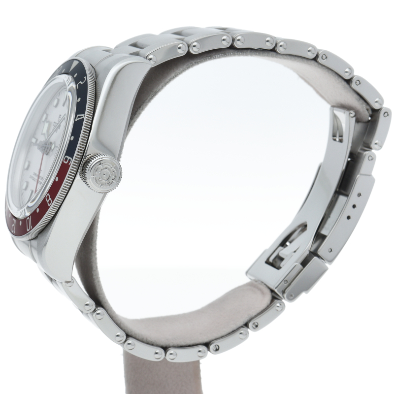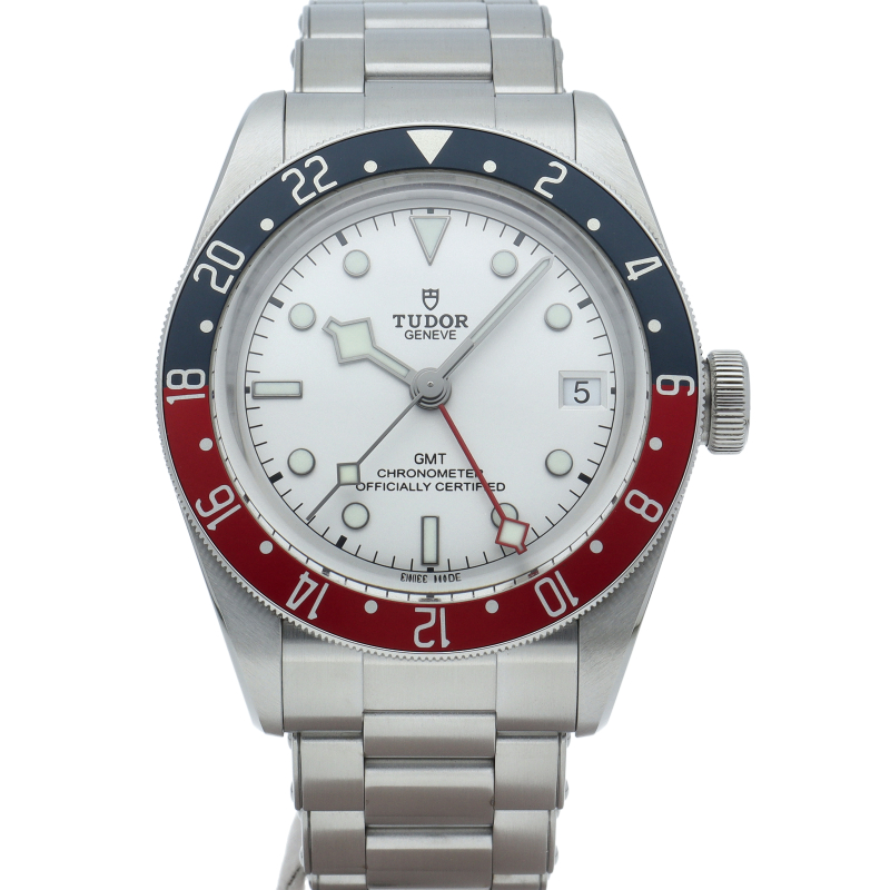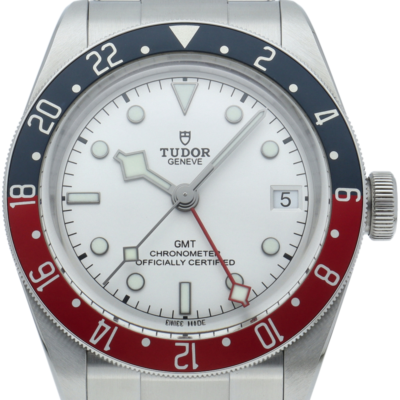 チュードルを代表するスポーツモデル「ブラックベイ」のGMT搭載モデル。ベゼルは昼夜がわかる様「ブルー/レッド」の2トーンの通称ペプシカラーとなっています。過去のダイバーズウォッチからインスピレーションを得た四角い針はGMT針にも付いています。自社製GMTムーブメント「MT5652」を搭載。70時間のパワーリザーブを誇り、クロノメーター認定を受けたムーブメントです。