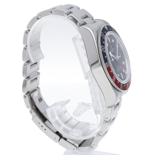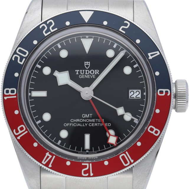 チュードルを代表するスポーツモデル「ブラックベイ」のGMT搭載モデル。ベゼルは昼夜がわかる様「ブルー/レッド」の2トーンの通称ペプシカラーとなっています。過去のダイバーズウォッチからインスピレーションを得た四角い針はGMT針にも付いています。自社製GMTムーブメント「MT5652」を搭載。70時間のパワーリザーブを誇り、クロノメーター認定を受けたムーブメントです。