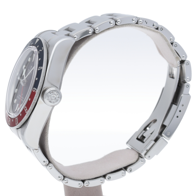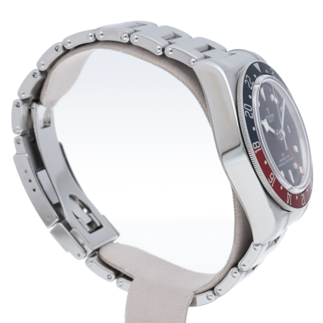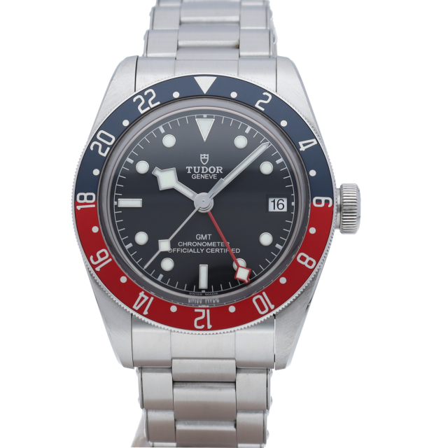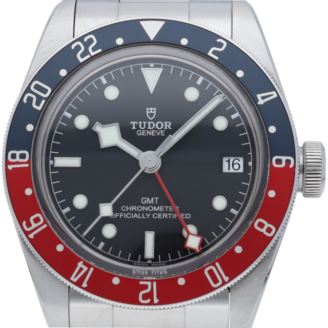 チュードルを代表するスポーツモデル「ブラックベイ」のGMT搭載モデル。ベゼルは昼夜がわかる様「ブルー/レッド」の2トーンの通称ペプシカラーとなっています。過去のダイバーズウォッチからインスピレーションを得た四角い針はGMT針にも付いています。自社製GMTムーブメント「MT5652」を搭載。70時間のパワーリザーブを誇り、クロノメーター認定を受けたムーブメントです。