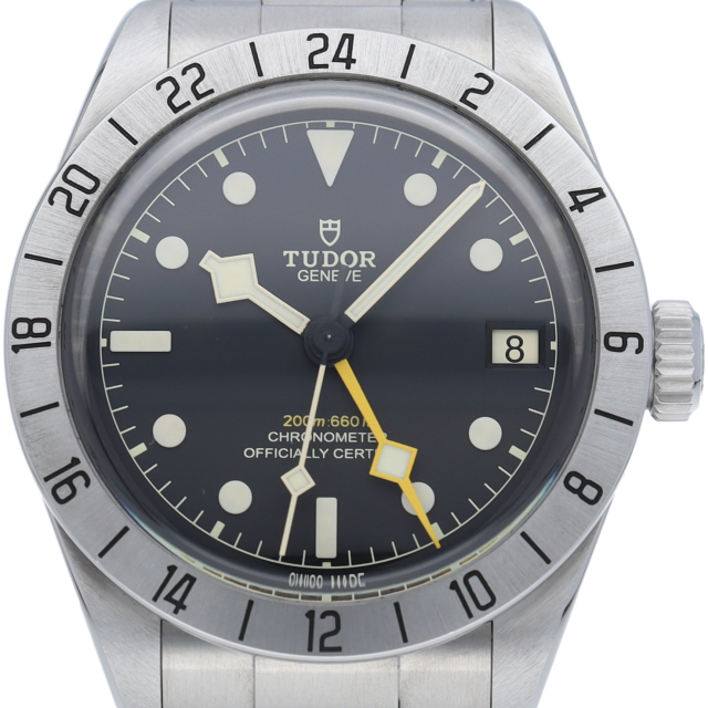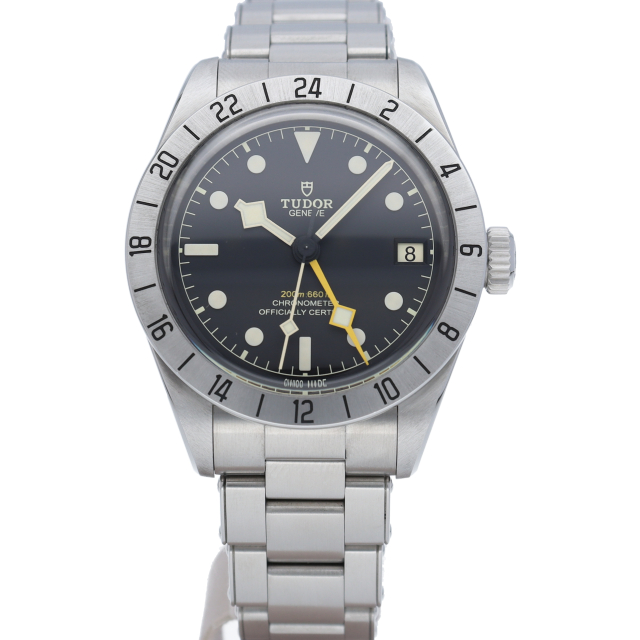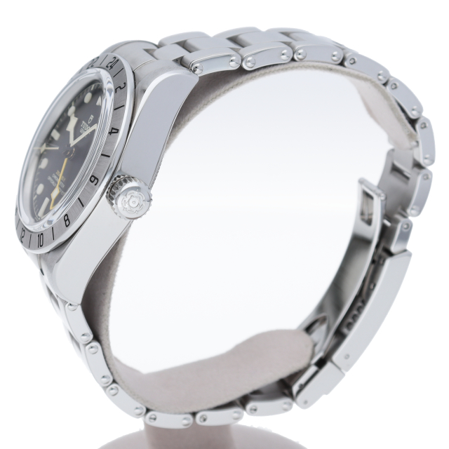 固定式のベゼルに刻印された24時間表示、大きめのイエローの24時間針等、ロレックスの初代エクスプローラー2を彷彿とさせるデザインで話題を呼んだブラックベイプロ。人気機種のフィフティーエイトと同じ39ミリケースを採用しており、日本人の手首周りにも馴染みやすいKサイズ感です。ムーブメントはクロノメーター認定を受け70時間のパワーリザーブを有する、両方向巻上げ式の自社製MT5652を搭載しています。