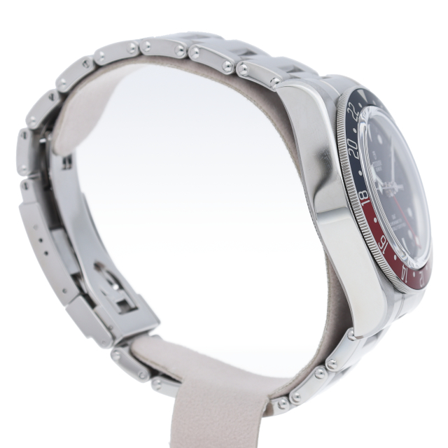 チュードルを代表するスポーツモデル「ブラックベイ」のGMT搭載モデル。ベゼルは昼夜がわかる様「ブルー/レッド」の2トーンの通称ペプシカラーとなっています。過去のダイバーズウォッチからインスピレーションを得た四角い針はGMT針にも付いています。自社製GMTムーブメント「MT5652」を搭載。70時間のパワーリザーブを誇り、クロノメーター認定を受けたムーブメントです。