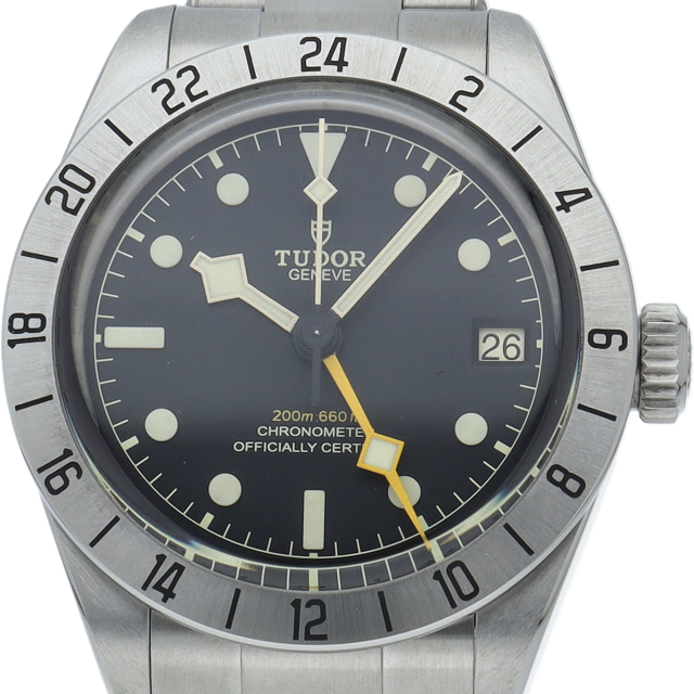 固定式のベゼルに刻印された24時間表示、大きめのイエローの24時間針等、ロレックスの初代エクスプローラー2を彷彿とさせるデザインで話題を呼んだブラックベイプロ。人気機種のフィフティーエイトと同じ39ミリケースを採用しており、日本人の手首周りにも馴染みやすいKサイズ感です。ムーブメントはクロノメーター認定を受け70時間のパワーリザーブを有する、両方向巻上げ式の自社製MT5652を搭載しています。
