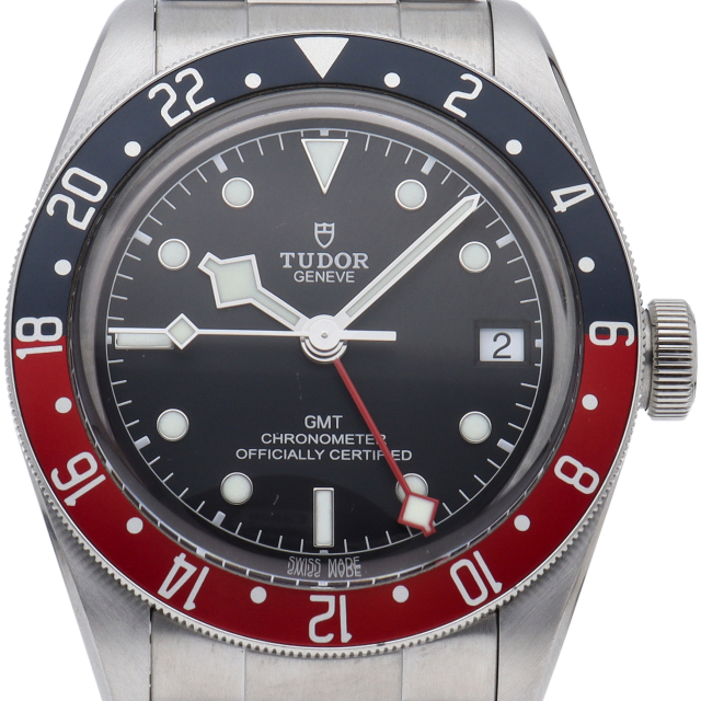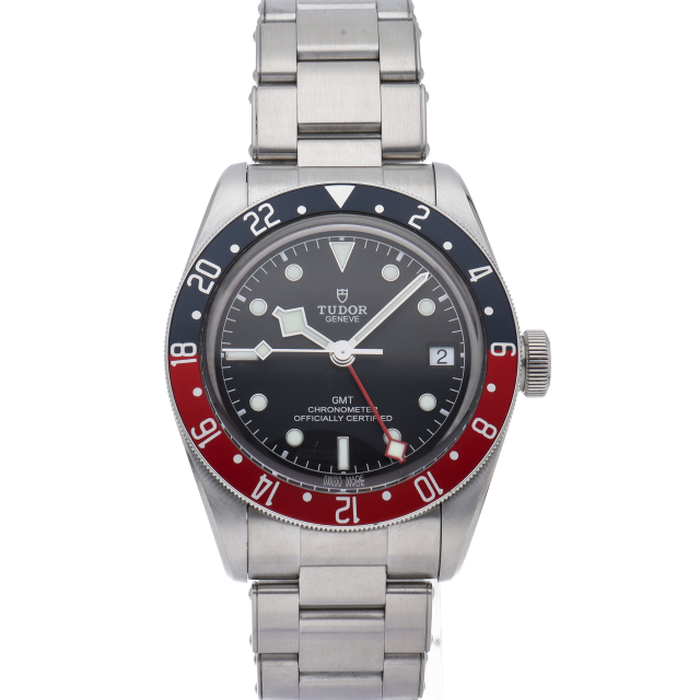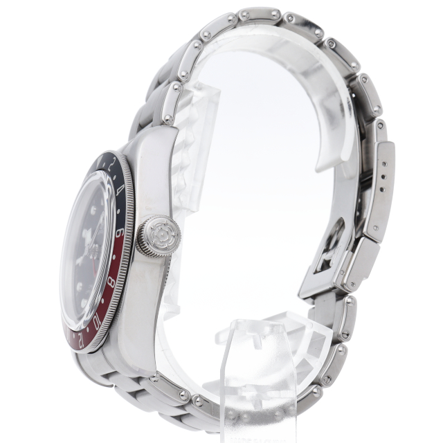 チュードルを代表するスポーツモデル「ブラックベイ」のGMT搭載モデル。ベゼルは昼夜がわかる様「ブルー/レッド」の2トーンの通称ペプシカラーとなっています。過去のダイバーズウォッチからインスピレーションを得た四角い針はGMT針にも付いています。自社製GMTムーブメント「MT5652」を搭載。70時間のパワーリザーブを誇り、クロノメーター認定を受けたムーブメントです。