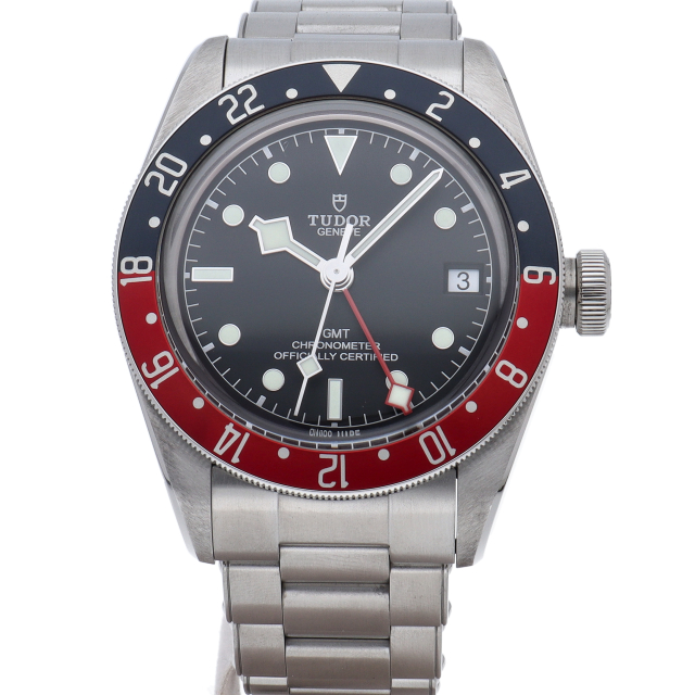 チュードルを代表するスポーツモデル「ブラックベイ」のGMT搭載モデル。ベゼルは昼夜がわかる様「ブルー/レッド」の2トーンの通称ペプシカラーとなっています。過去のダイバーズウォッチからインスピレーションを得た四角い針はGMT針にも付いています。自社製GMTムーブメント「MT5652」を搭載。70時間のパワーリザーブを誇り、クロノメーター認定を受けたムーブメントです。