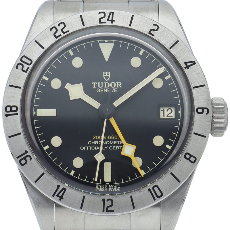 固定式のベゼルに刻印された24時間表示、大きめのイエローの24時間針等、ロレックスの初代エクスプローラー2を彷彿とさせるデザインで話題を呼んだブラックベイプロ。人気機種のフィフティーエイトと同じ39ミリケースを採用しており、日本人の手首周りにも馴染みやすいKサイズ感です。ムーブメントはクロノメーター認定を受け70時間のパワーリザーブを有する、両方向巻上げ式の自社製MT5652を搭載しています。