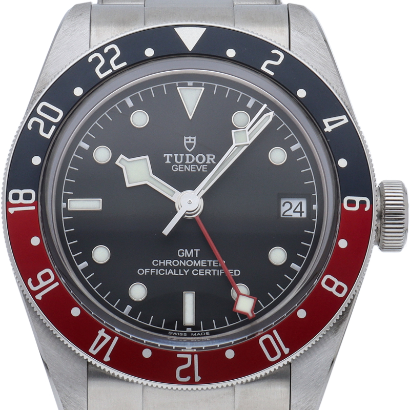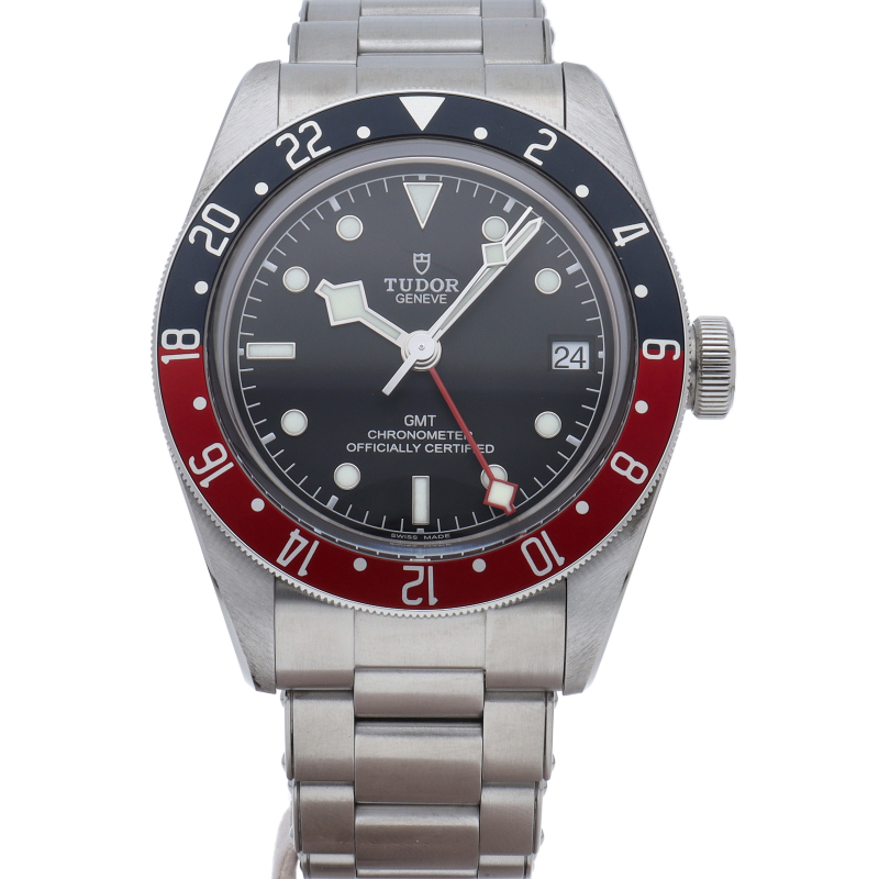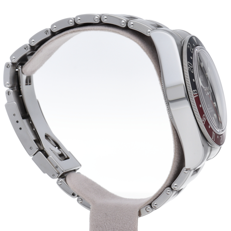 チュードルを代表するスポーツモデル「ブラックベイ」のGMT搭載モデル。ベゼルは昼夜がわかる様「ブルー/レッド」の2トーンの通称ペプシカラーとなっています。過去のダイバーズウォッチからインスピレーションを得た四角い針はGMT針にも付いています。自社製GMTムーブメント「MT5652」を搭載。70時間のパワーリザーブを誇り、クロノメーター認定を受けたムーブメントです。
