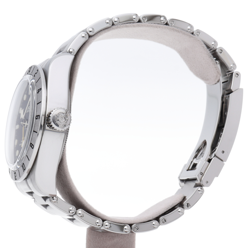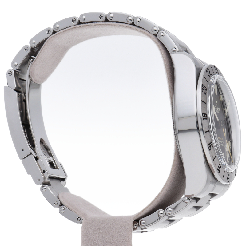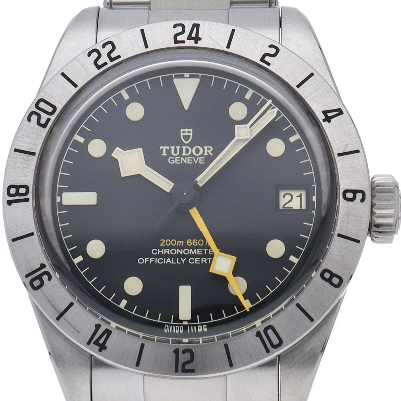 固定式のベゼルに刻印された24時間表示、大きめのイエローの24時間針等、ロレックスの初代エクスプローラー2を彷彿とさせるデザインで話題を呼んだブラックベイプロ。人気機種のフィフティーエイトと同じ39ミリケースを採用しており、日本人の手首周りにも馴染みやすいKサイズ感です。ムーブメントはクロノメーター認定を受け70時間のパワーリザーブを有する、両方向巻上げ式の自社製MT5652を搭載しています。