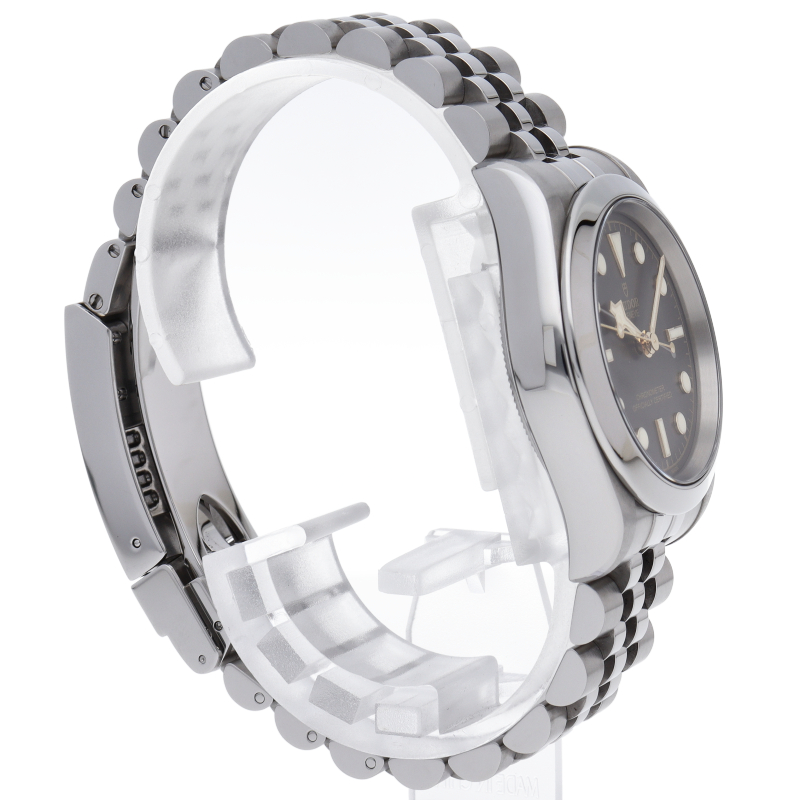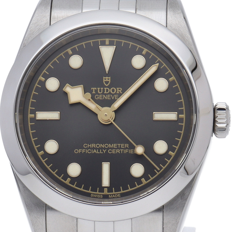 ブラックベイ31のオールステンレスモデルとなります。日本では通称「イカ針」と呼ばれ、ヴィンテージのチューダー サブマリーナの代名詞とも言われる「スノーフレーク針」を採用し回転ベゼルがなくなったことで強調されるリューズには、現行モデルの盾マークではなくチューダーローズがエングレービングされています。