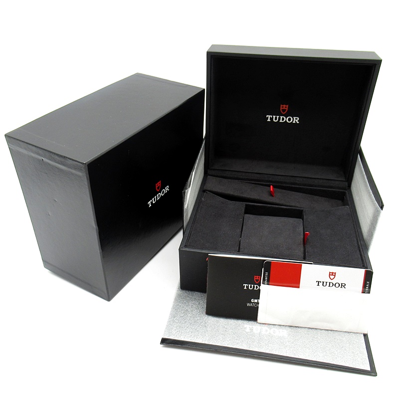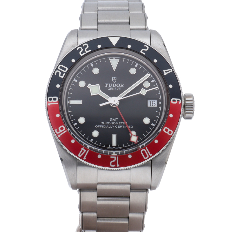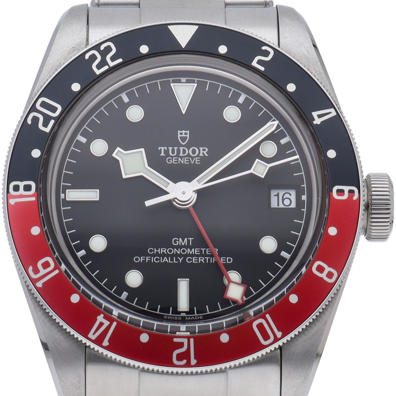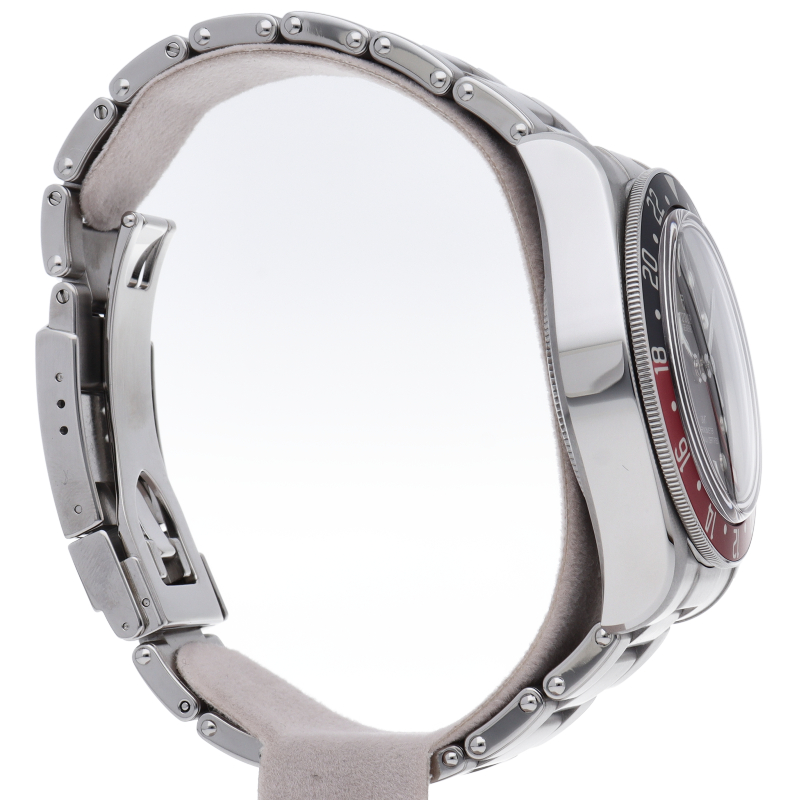 チュードルを代表するスポーツモデル「ブラックベイ」のGMT搭載モデル。ベゼルは昼夜がわかる様「ブルー/レッド」の2トーンの通称ペプシカラーとなっています。過去のダイバーズウォッチからインスピレーションを得た四角い針はGMT針にも付いています。自社製GMTムーブメント「MT5652」を搭載。70時間のパワーリザーブを誇り、クロノメーター認定を受けたムーブメントです。