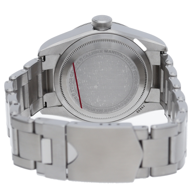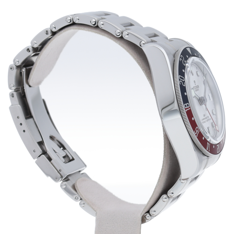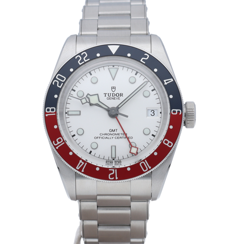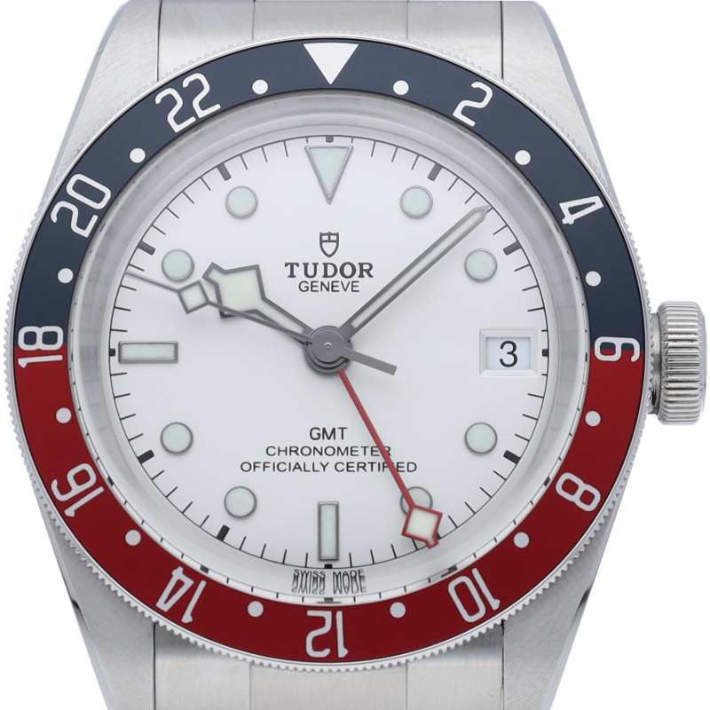 チュードルを代表するスポーツモデル「ブラックベイ」のGMT搭載モデル。ベゼルは昼夜がわかる様「ブルー/レッド」の2トーンの通称ペプシカラーとなっています。過去のダイバーズウォッチからインスピレーションを得た四角い針はGMT針にも付いています。自社製GMTムーブメント「MT5652」を搭載。70時間のパワーリザーブを誇り、クロノメーター認定を受けたムーブメントです。