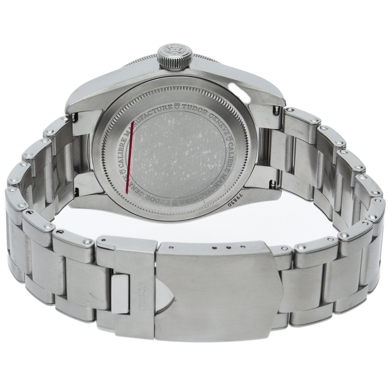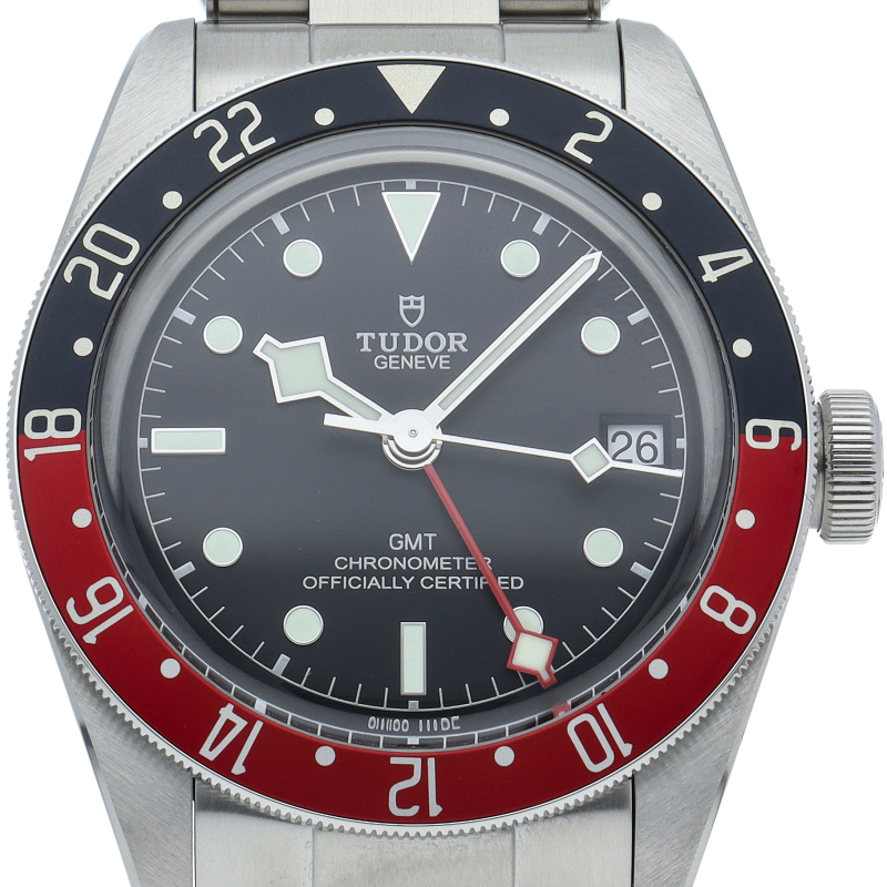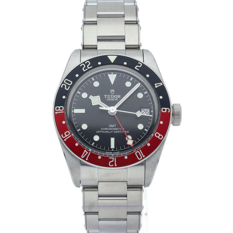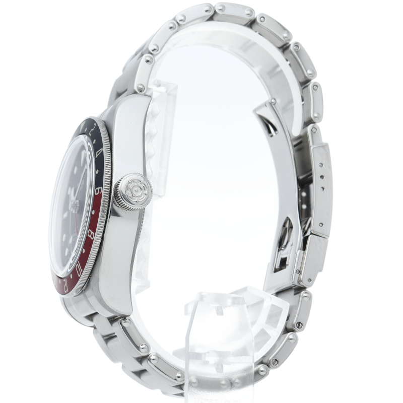 チュードルを代表するスポーツモデル「ブラックベイ」のGMT搭載モデル。ベゼルは昼夜がわかる様「ブルー/レッド」の2トーンの通称ペプシカラーとなっています。過去のダイバーズウォッチからインスピレーションを得た四角い針はGMT針にも付いています。自社製GMTムーブメント「MT5652」を搭載。70時間のパワーリザーブを誇り、クロノメーター認定を受けたムーブメントです。