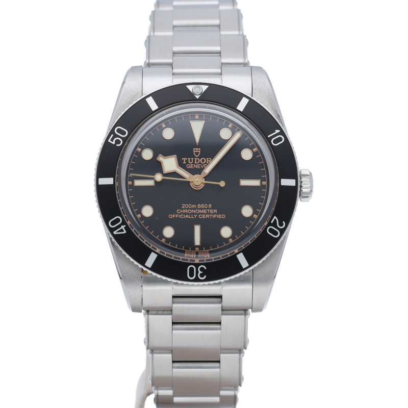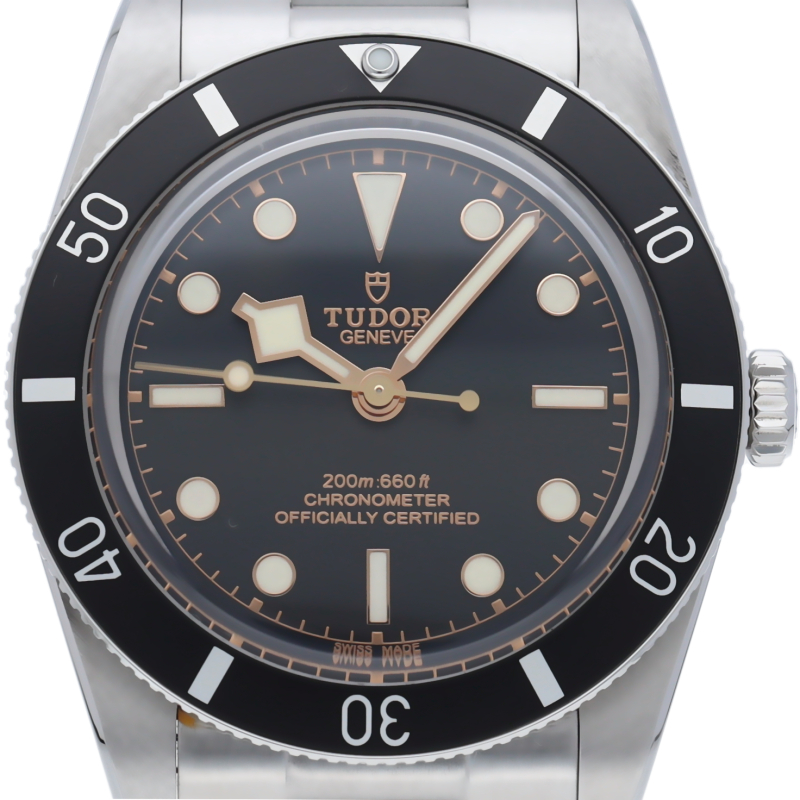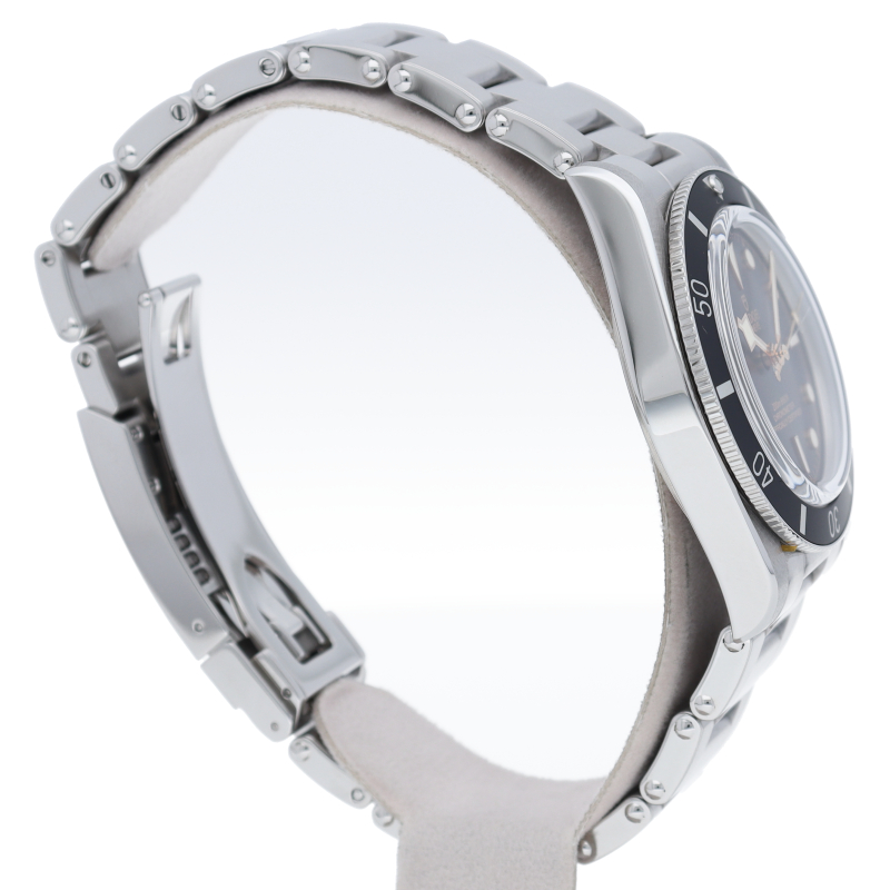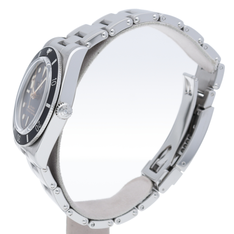 チューダーの初期のサブマリーナに使用されていた通称“イカ針”を採用した「ブラックベイ」。こちらはステンレスタイプで、ケース径37mmモデル。1960年代までのロレックスやチューダーに使われていたリベットブレス仕様のダイバーウォッチです。
