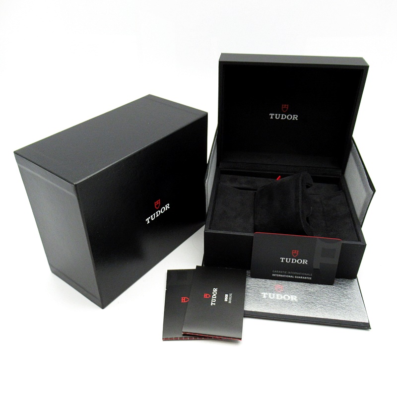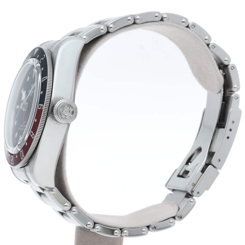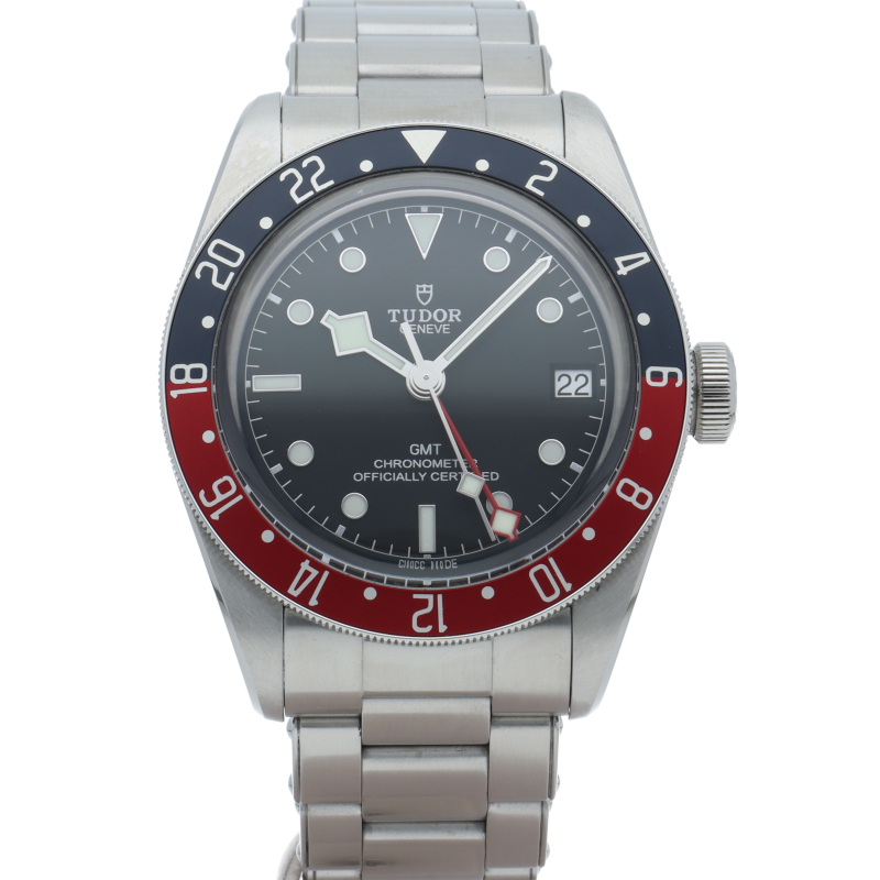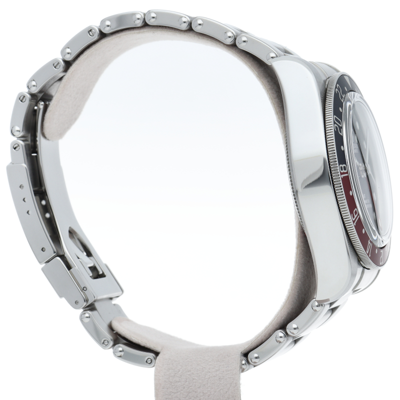 チュードルを代表するスポーツモデル「ブラックベイ」のGMT搭載モデル。ベゼルは昼夜がわかる様「ブルー/レッド」の2トーンの通称ペプシカラーとなっています。過去のダイバーズウォッチからインスピレーションを得た四角い針はGMT針にも付いています。自社製GMTムーブメント「MT5652」を搭載。70時間のパワーリザーブを誇り、クロノメーター認定を受けたムーブメントです。