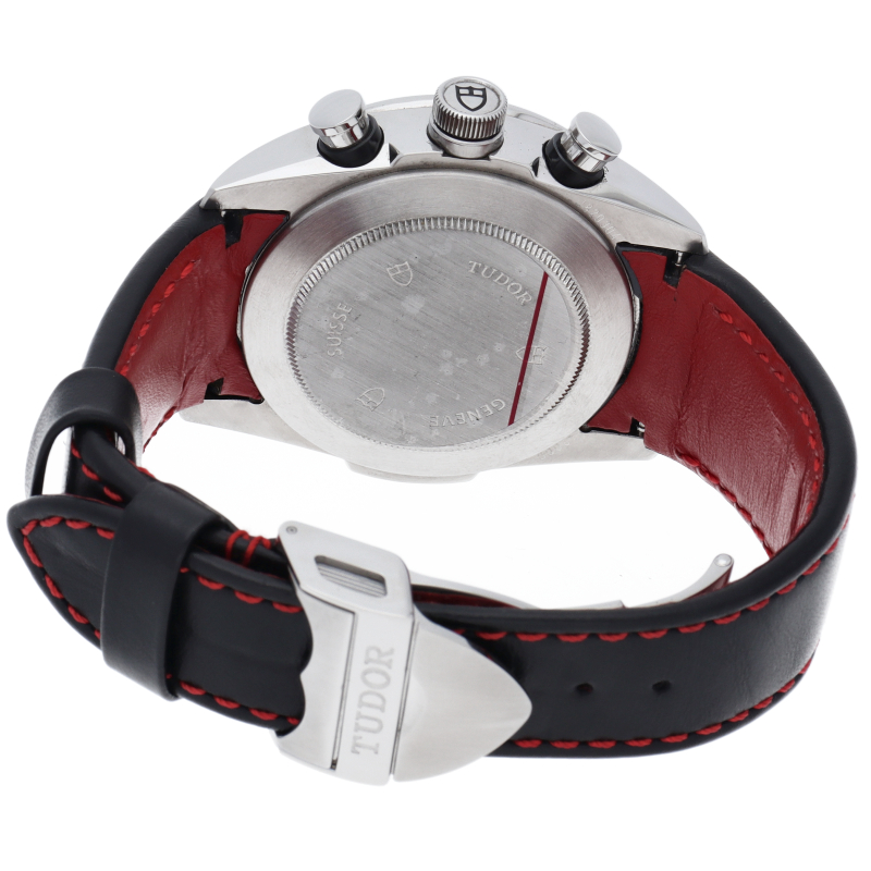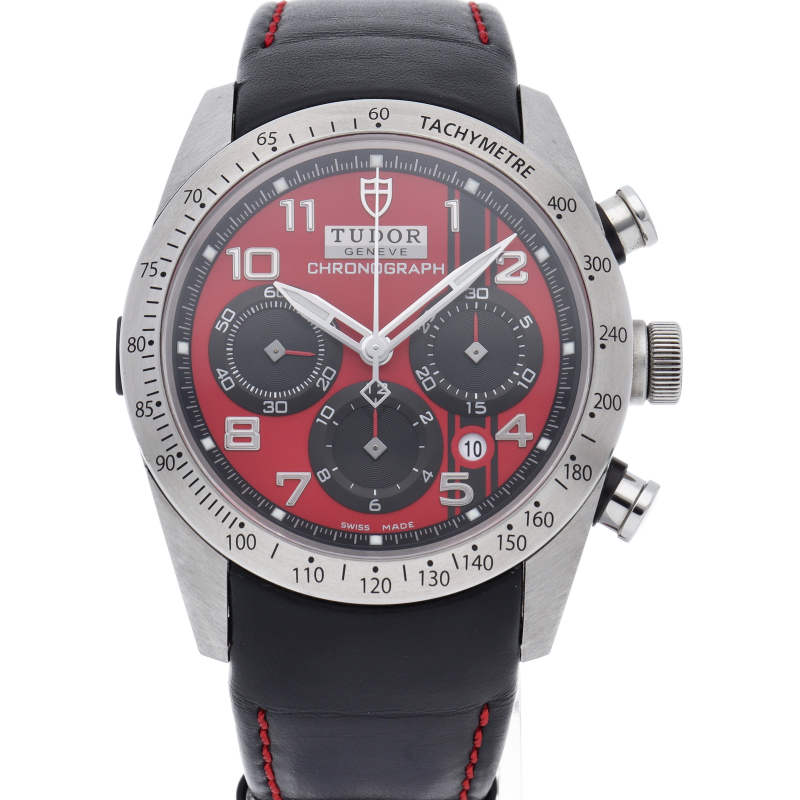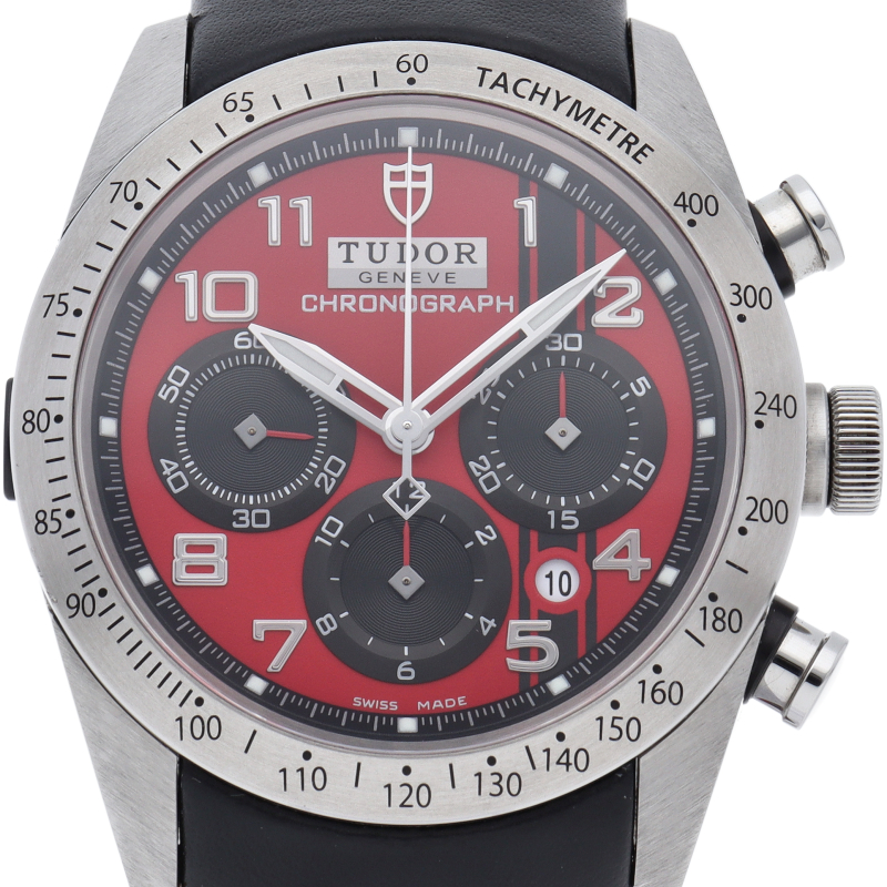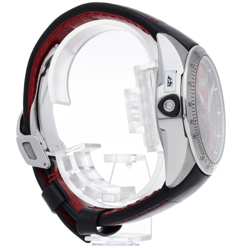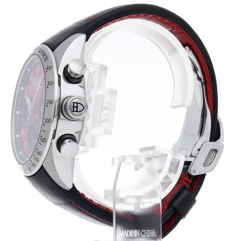 モータースポーツをイメージしてデザインされた「ファストライダー クロノグラフ」。オートバイメーカーのドゥカティとのパートナーシップにより製作されたモデルで、ケース9時位置サイドの日付早送り用のプッシュボタンはドゥカティのロゴを模してデザインされています。