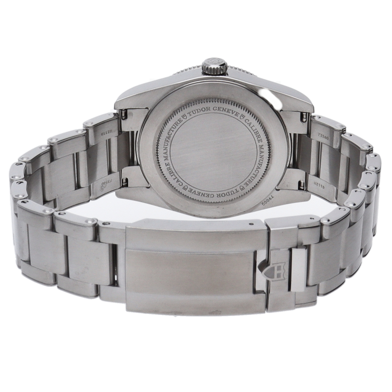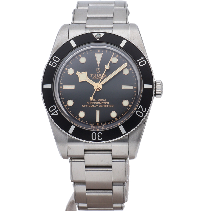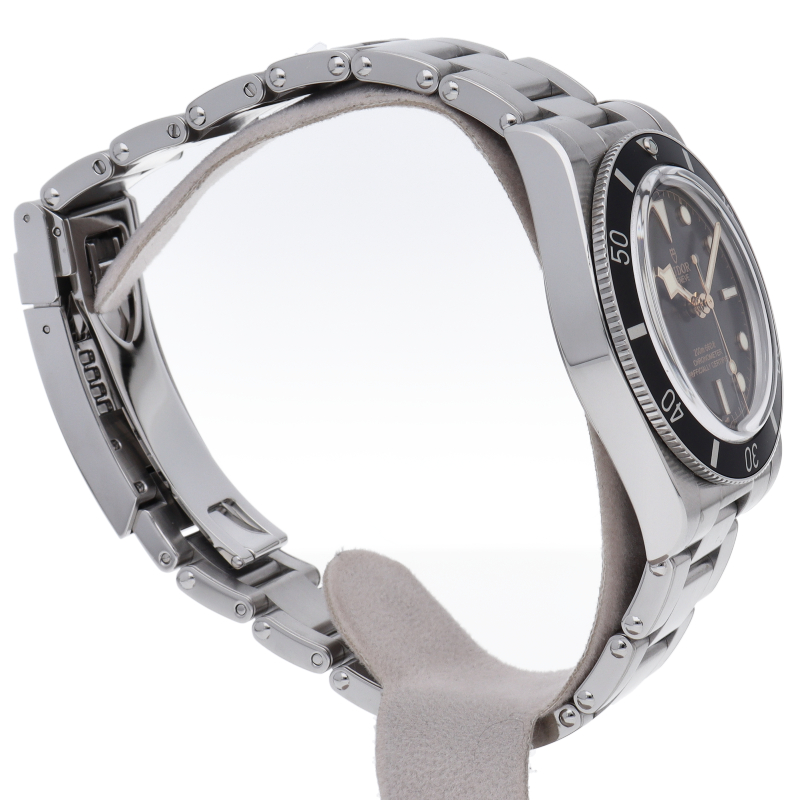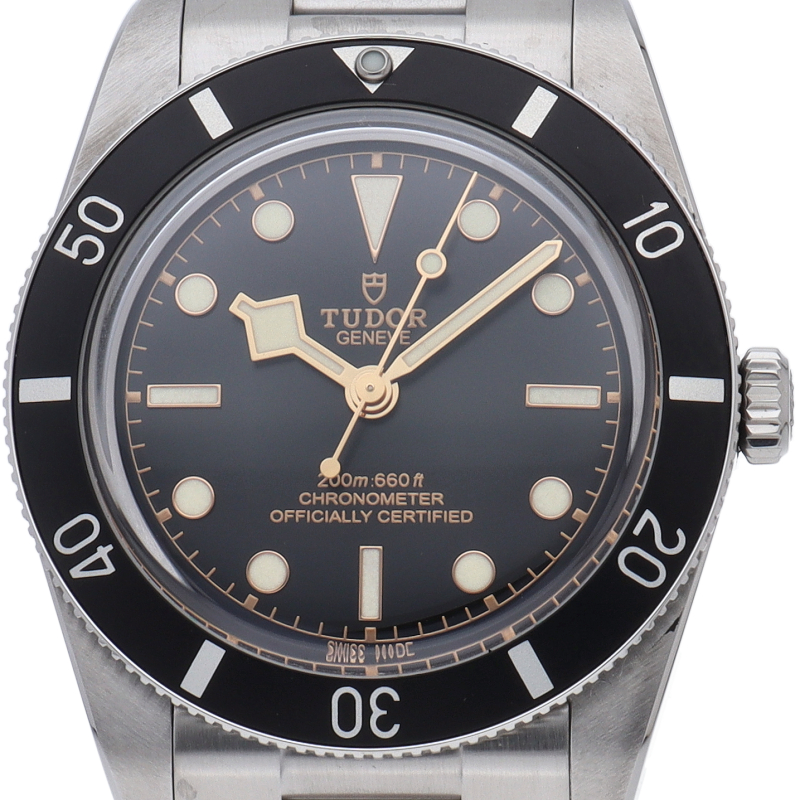 チューダーの初期のサブマリーナに使用されていた通称“イカ針”を採用した「ブラックベイ」。こちらはステンレスタイプで、ケース径37mmモデル。1960年代までのロレックスやチューダーに使われていたリベットブレス仕様のダイバーウォッチです。